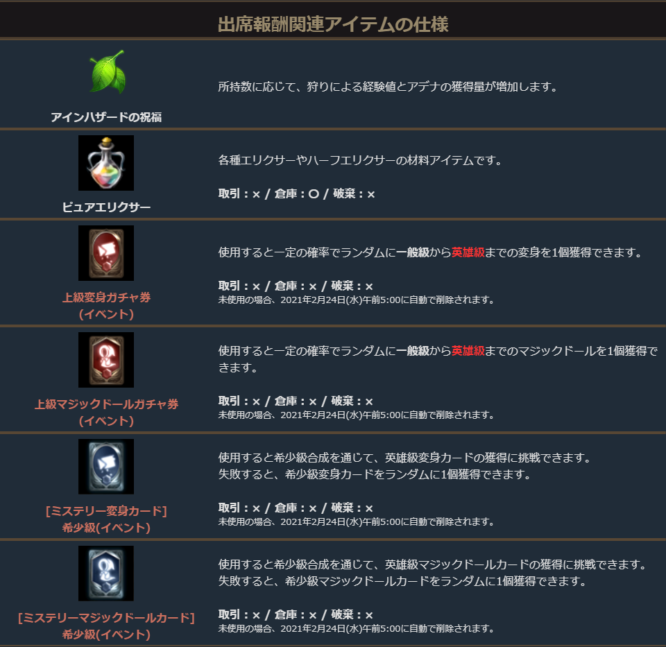 ※一部アイテムが期間終了後も未使用の場合、一定期間が経過すると自動で削除されます。詳しくは各アイテムの詳細をご確認ください。