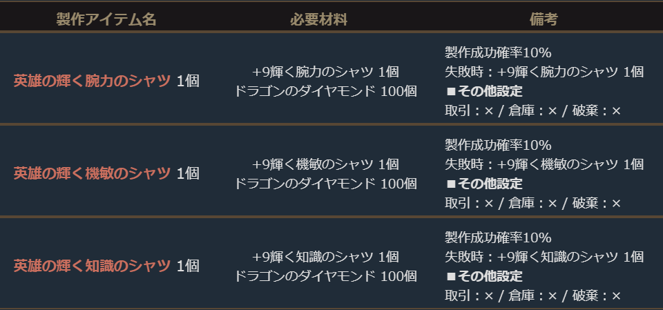 各種「+9輝くシャツ」を素材とすることで、対応する「英雄の輝くシャツ」の製作に挑戦することができます。