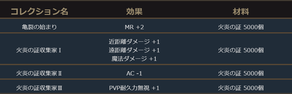 「火炎の証」を集めることで、下記のコレクションをに登録できます。