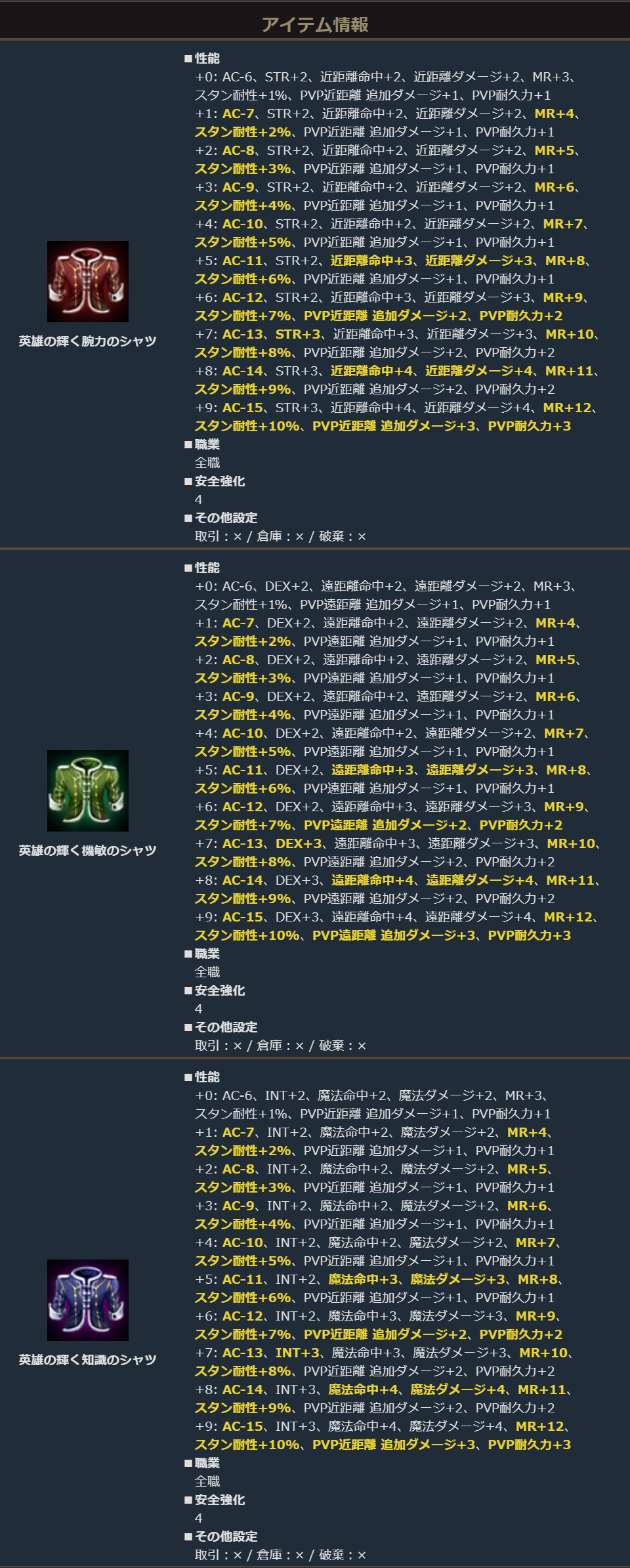 「英雄の輝くシャツ」は「輝くシャツ」に比べて、対応するSTR、DEX、INTの能力が高いことが特徴です。