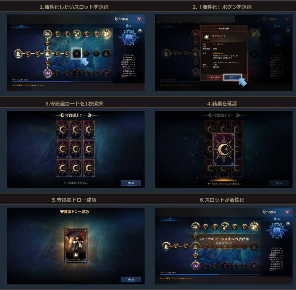 「守護石」を消費することで守護星ドローに挑戦することができ、ドローに成功すると守護星の効果が活性化します。