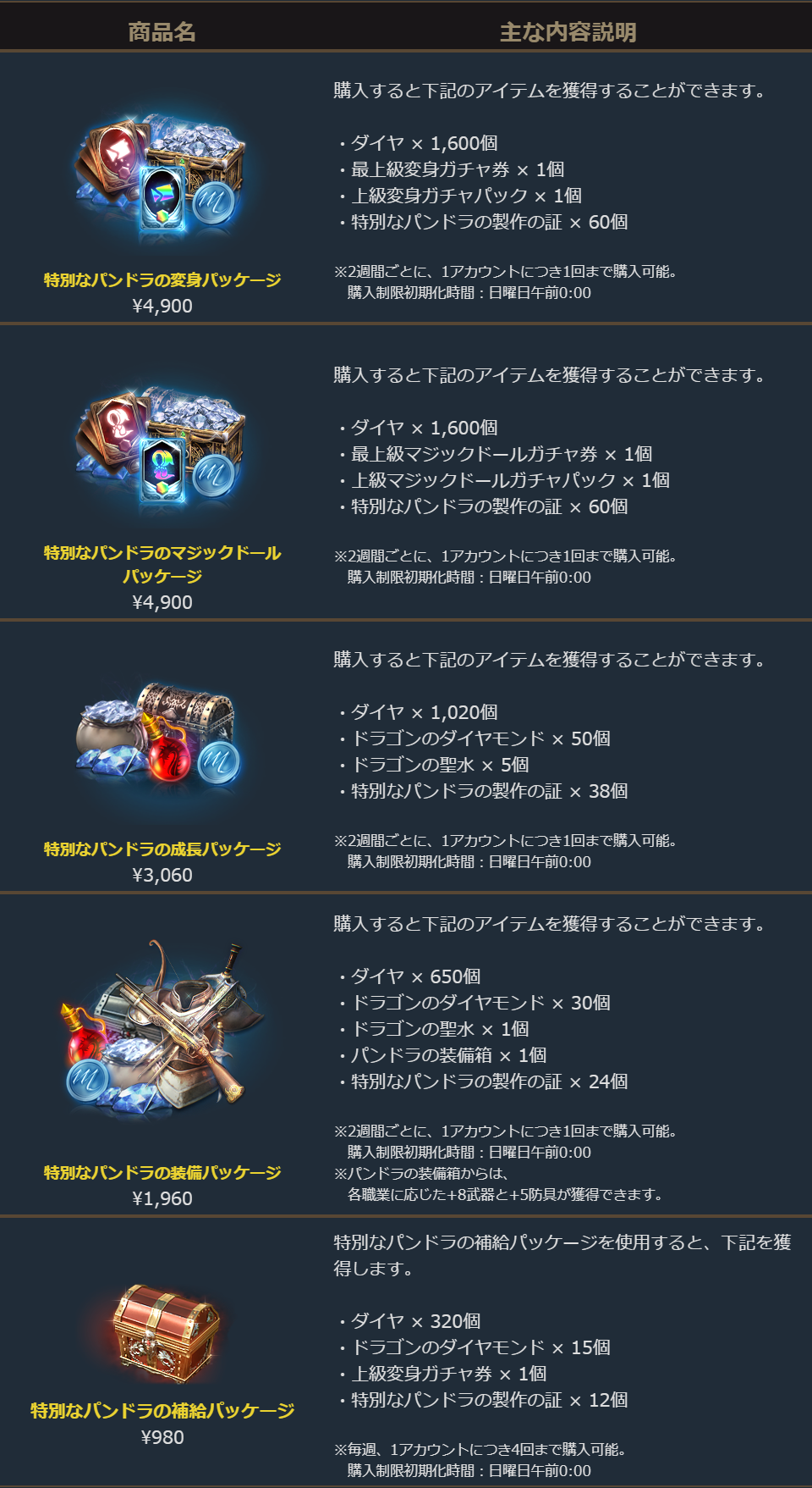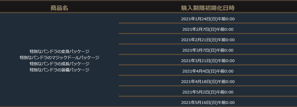 その後、「特別なパンドラの補給パッケージ」は毎週日曜日の午前0:00に購入制限が初期化されます。