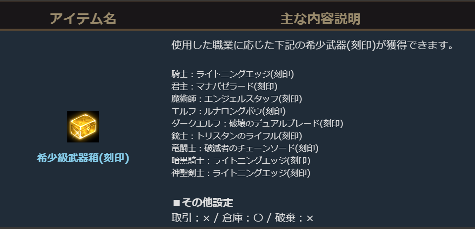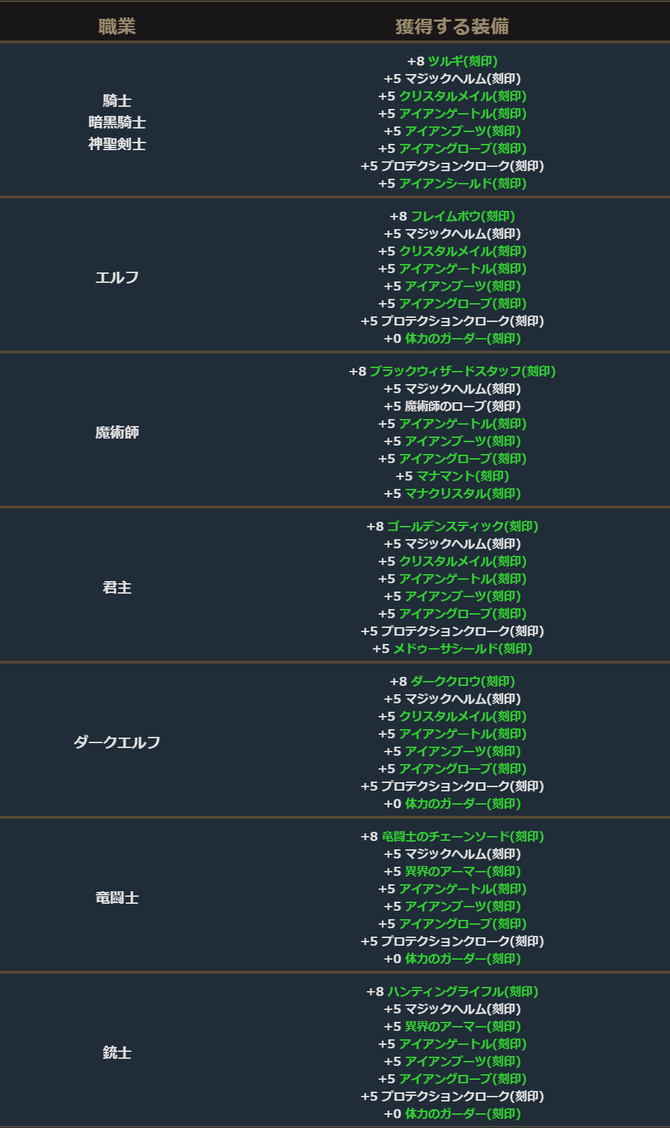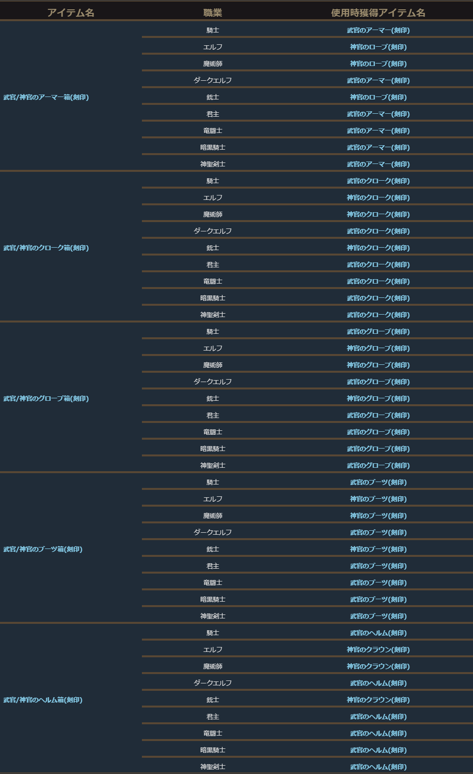 各種パンドラの装備箱から各職業ごとに獲得できる装備は以下となります。