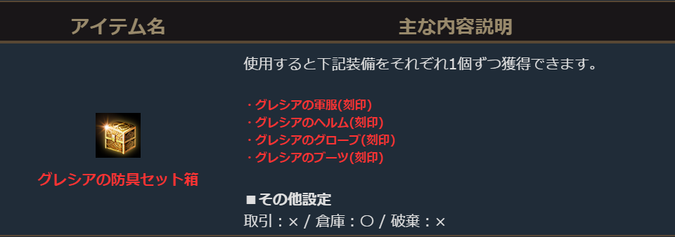 ※グレシアの防具セット箱(刻印)は、エルフか銃士以外の職業で使用することはできません。