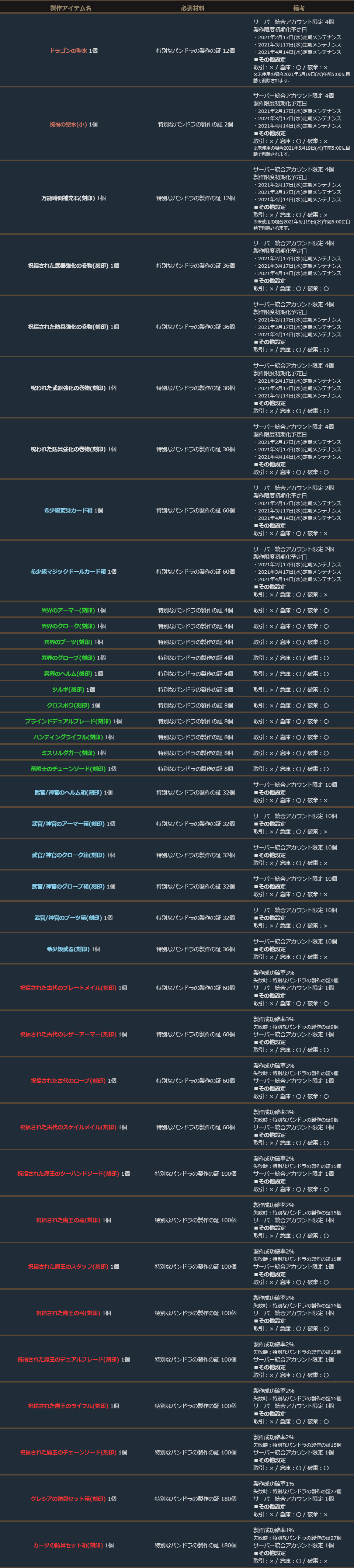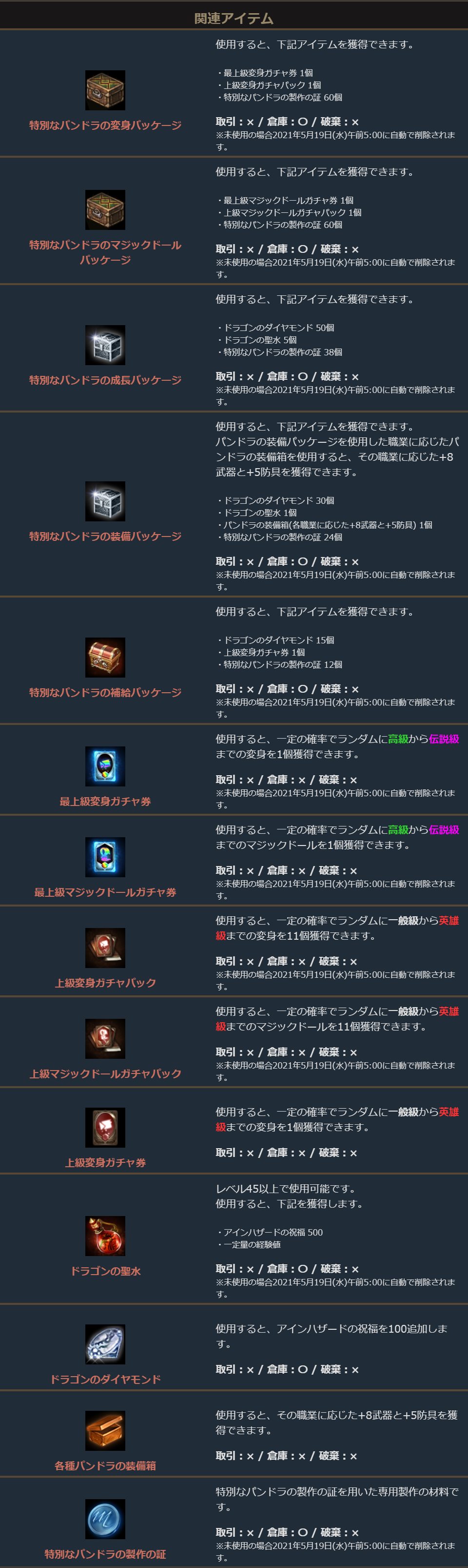 ※「特別なパンドラの製作の証」の製作を通じて獲得できるアイテムは全て取引所に登録することが出来ません。