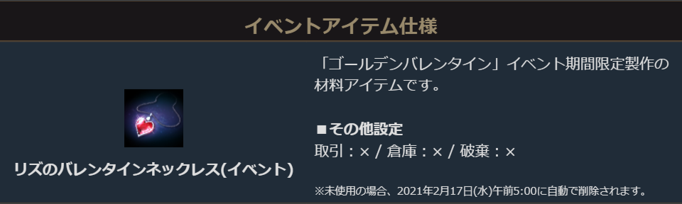 「リズのバレンタインネックレス(イベント)」を沢山集めてイベント期間限定製作にチャレンジしてください。