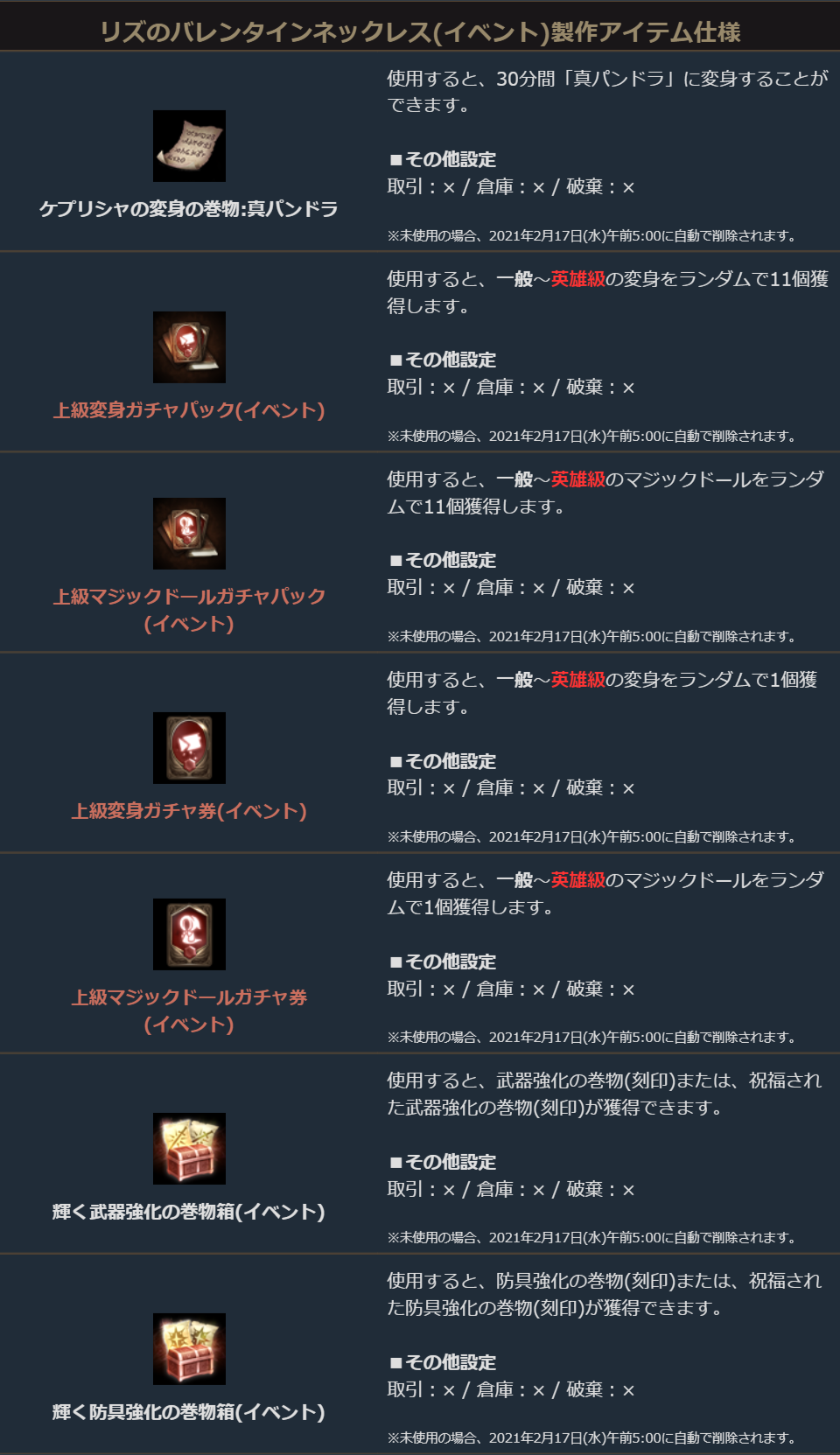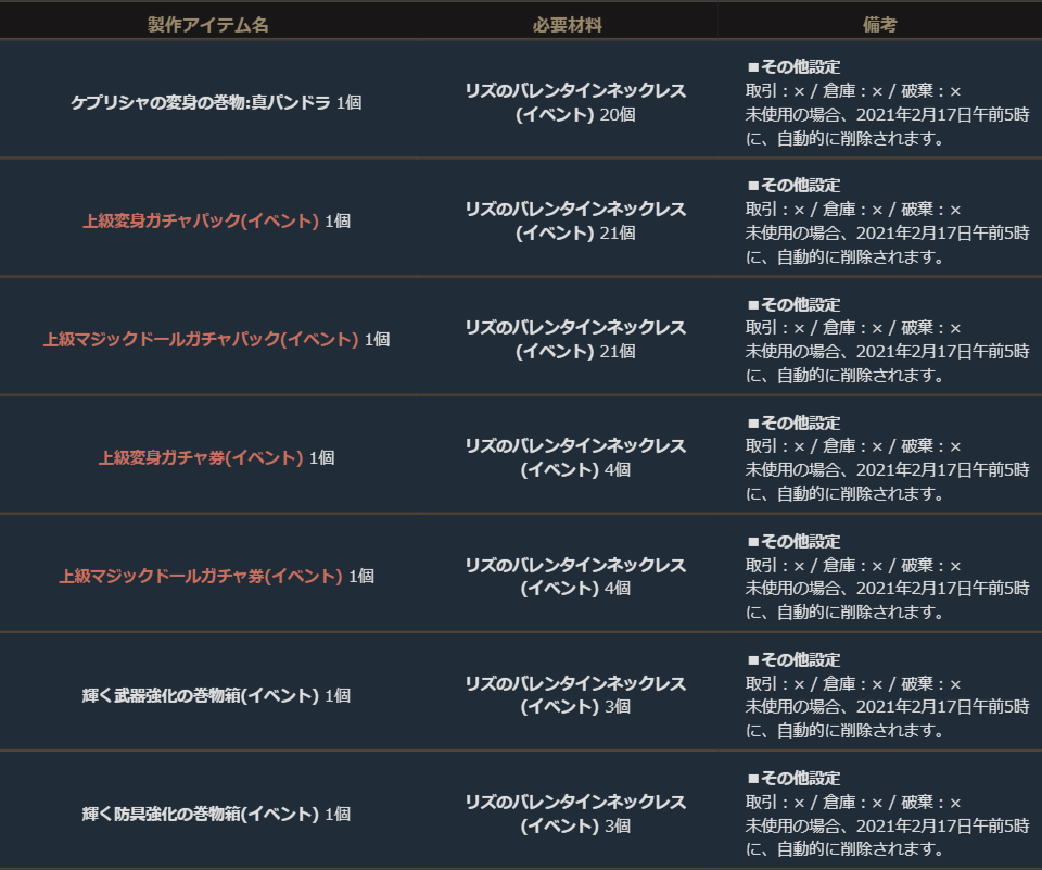 「リズのバレンタインネックレス(イベント)」を用いた製作では、伝説級変身を体験出来る巻物や、変身/マジックドールのガチャ券、武器/防具強化の巻物が獲得できる箱などが製作できます。