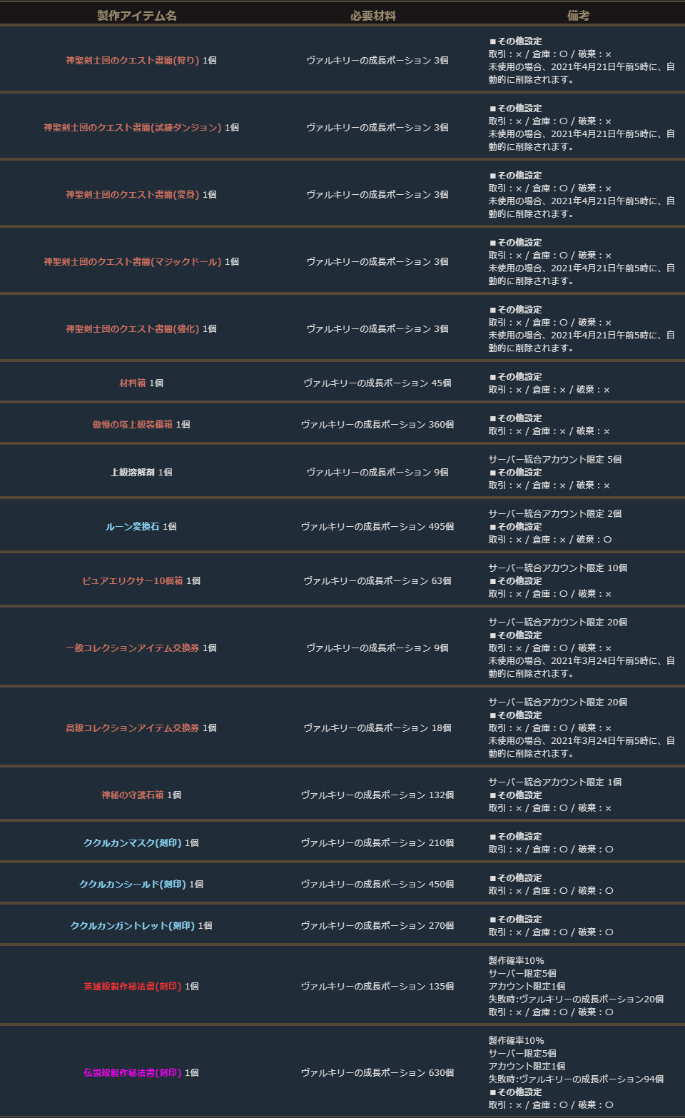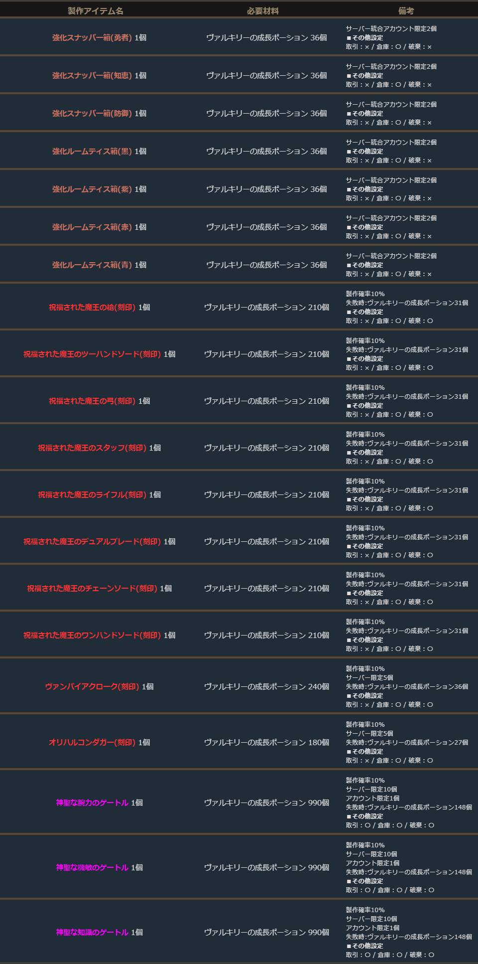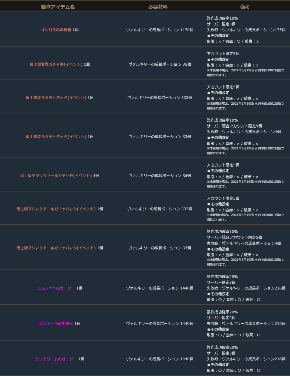 期間中、「ヴァルキリーの成長ポーション」を使用して、下記の製作を行うことができます。
