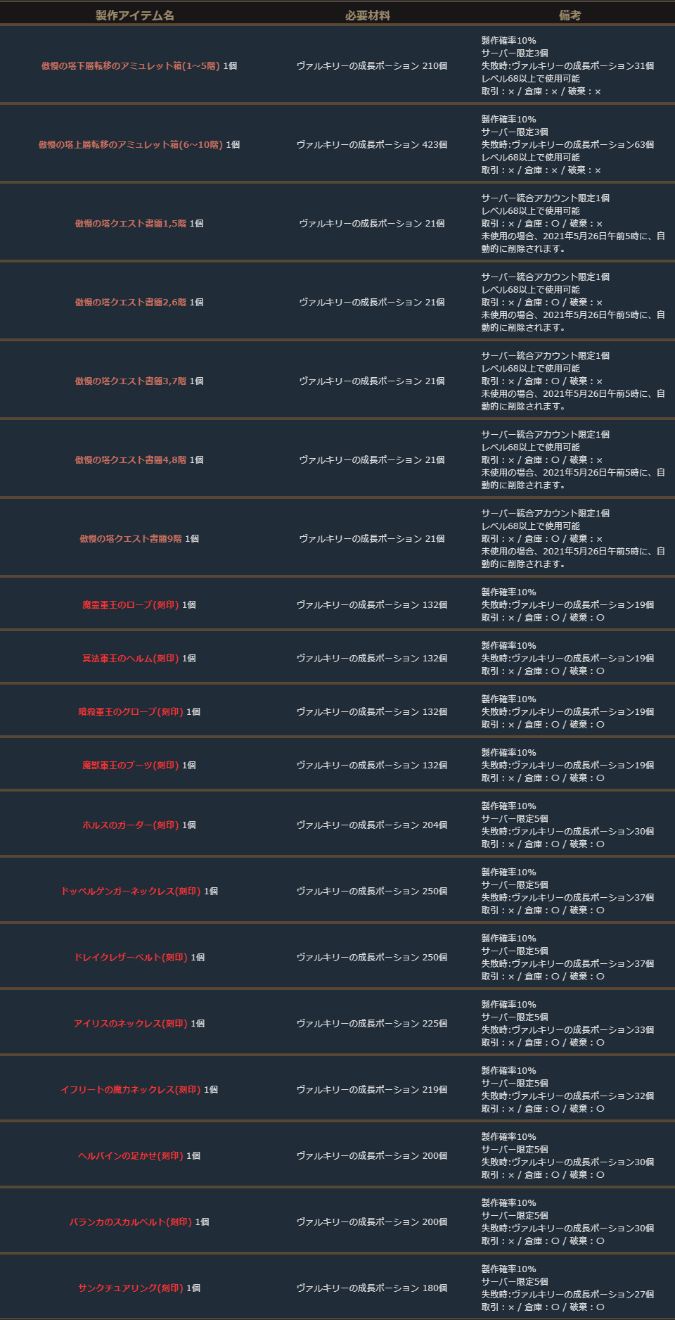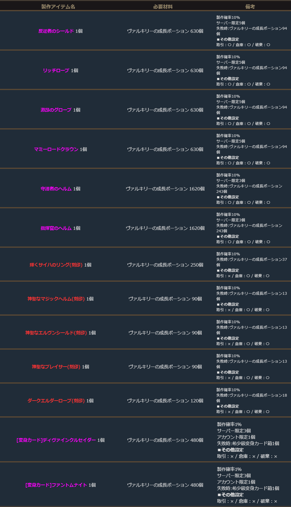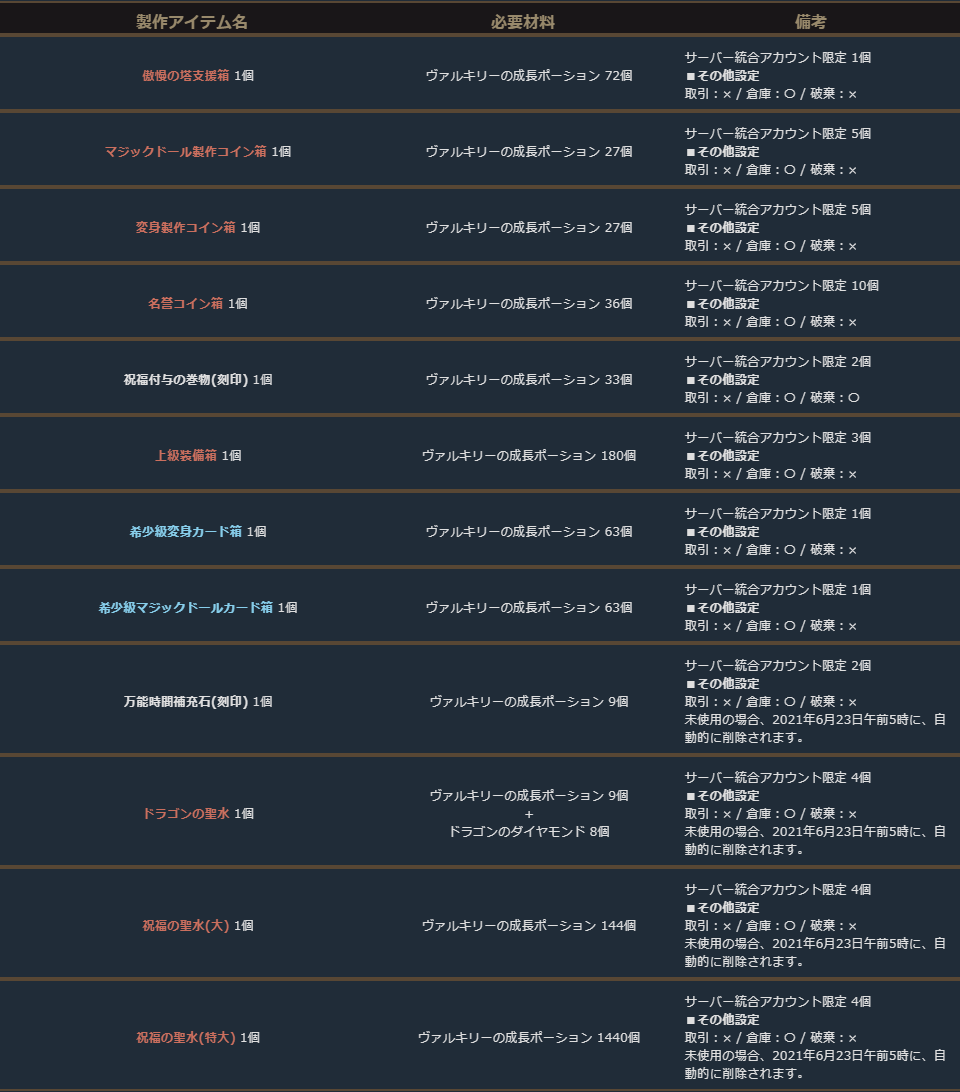 期間中、「ヴァルキリーの成長ポーション」を使用して、下記の製作を行うことができます。