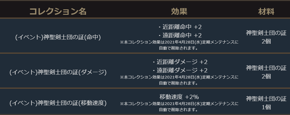 「神聖剣士団の成長パッケージ(ドラゴンのダイヤモンド/変身/マジックドール)」に付属している「神聖剣士団の証」を使用して、期間制のコレクションを登録することができます。