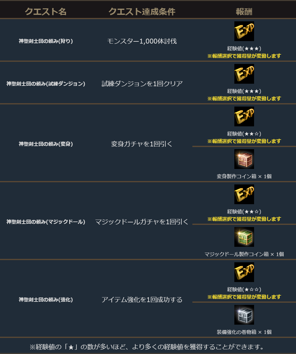 「ヴァルキリーの成長ポーション」を使用して製作できる各「神聖剣士団のクエスト書簡」は、使用すると専用クエストを受注できます。