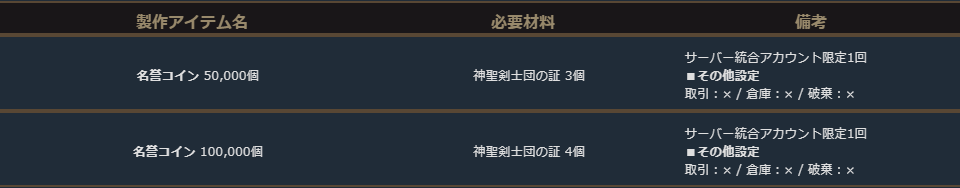 ※サーバー数量限定の製作アイテムは、各サーバーで製作できる数量に上限があります。