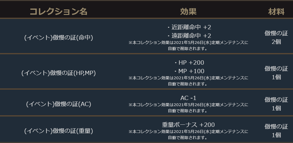 また、クエスト報酬で手に入る「傲慢の証」を使用して、期間制のコレクションを登録することができます。