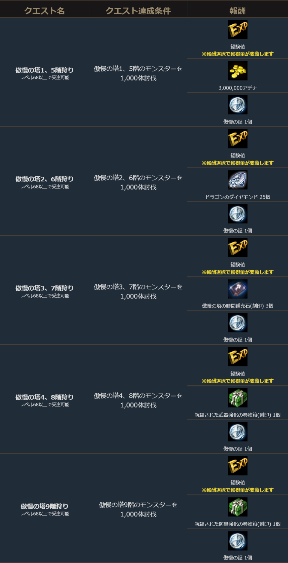 「ヴァルキリーの成長ポーション」を使用して製作できる各「傲慢の塔クエスト書簡」は、使用すると専用クエストを受注できます。
