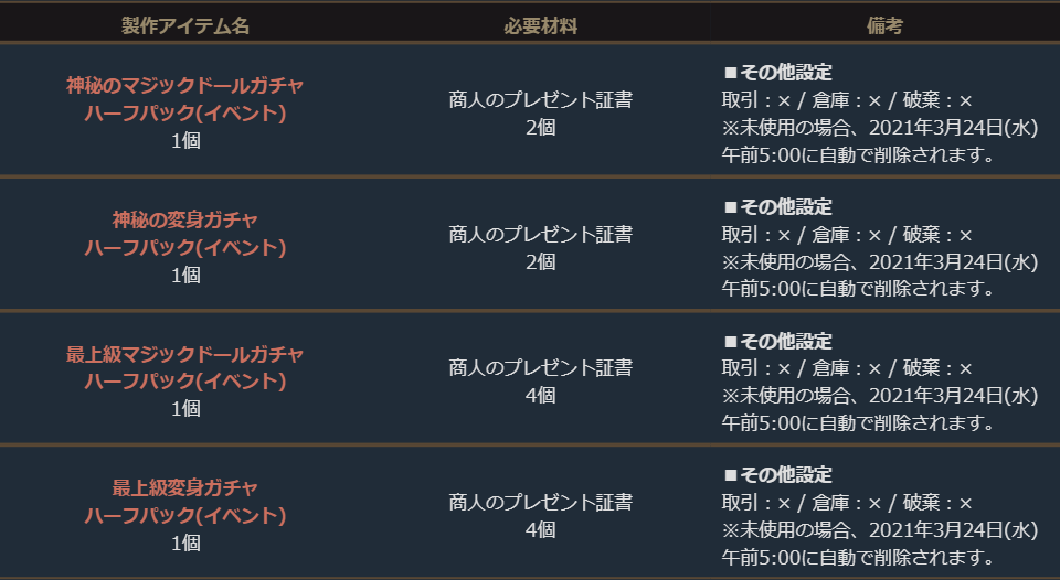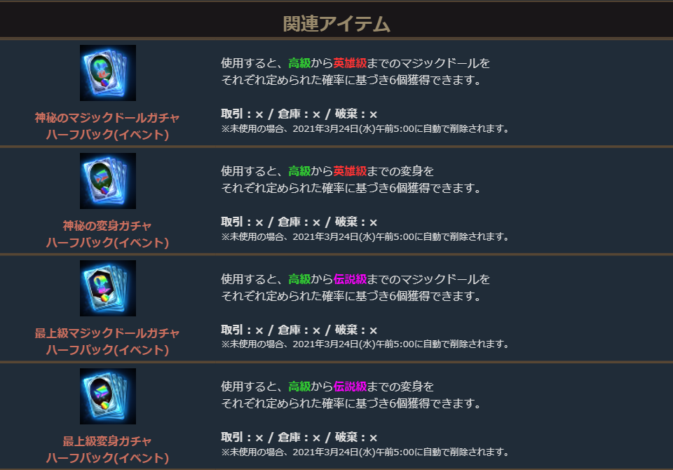 ※一部アイテムは未使用の場合、一定期間が経過すると自動で削除されます。詳しくは各アイテムの詳細をご確認ください。