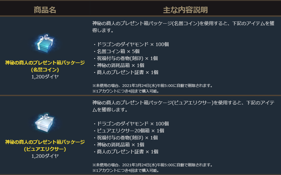 2021年3月10日より、ゲーム内ショップで「神秘の商人のプレゼント箱パッケージ」の販売を開始しました。