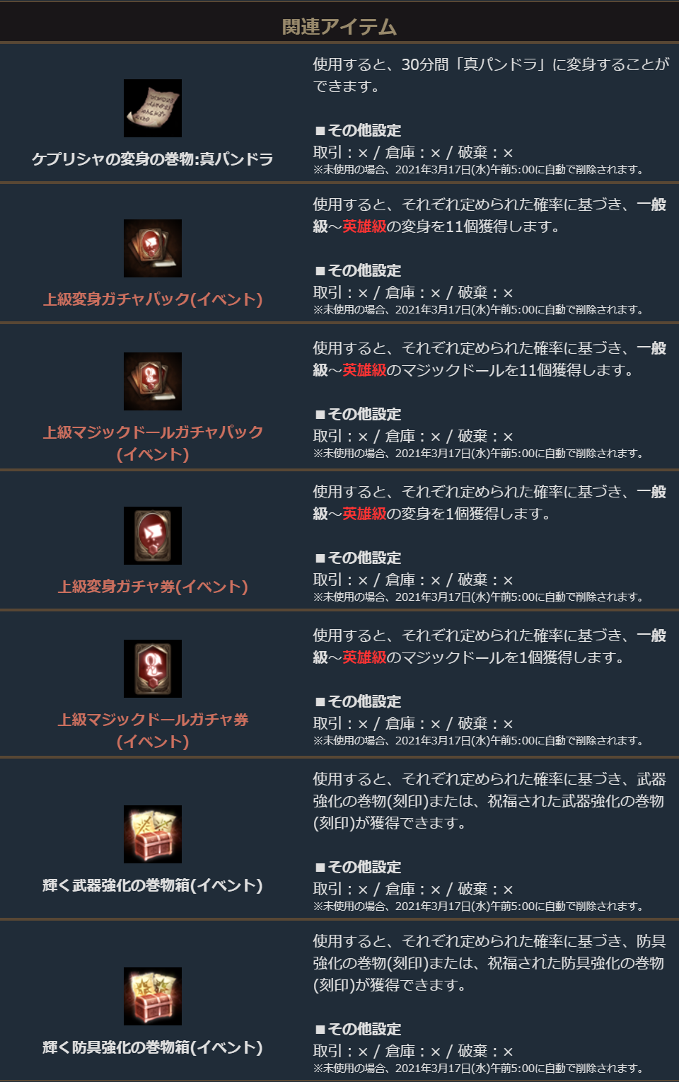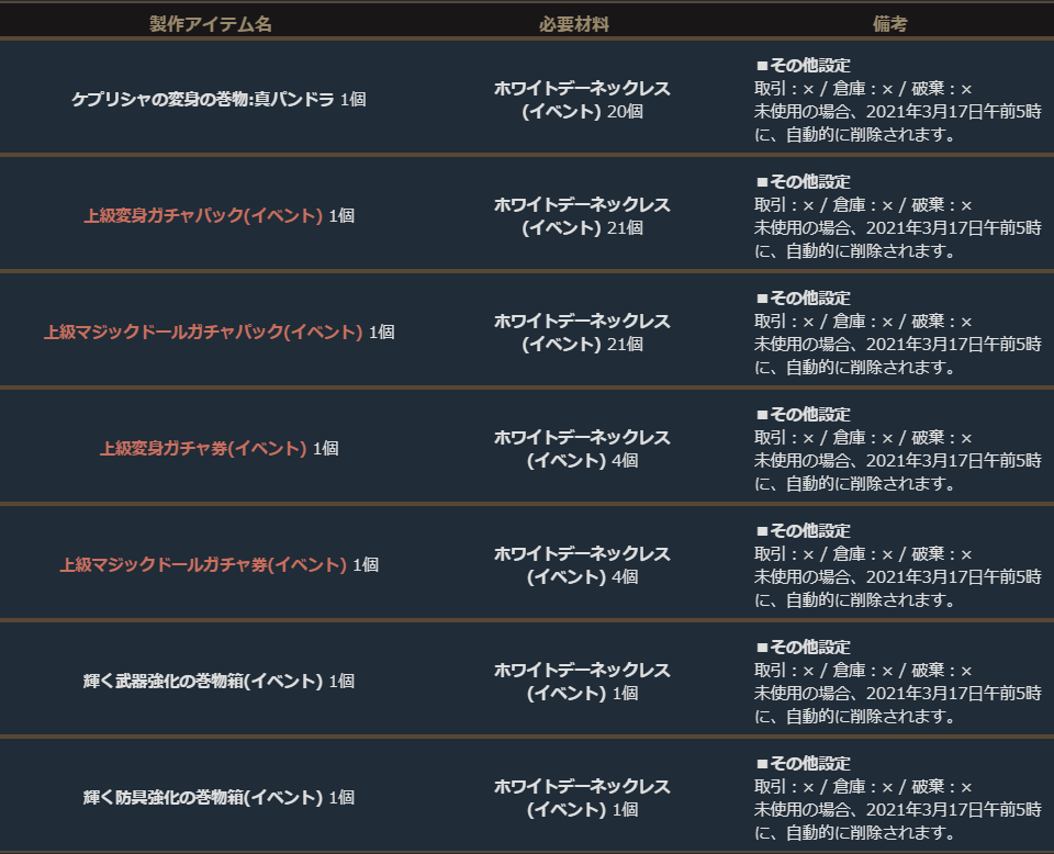 「ホワイトデーネックレス(イベント)」を用いた製作では、伝説級変身を体験出来る巻物や、変身/マジックドールのガチャ券、武器/防具強化の巻物が獲得できる箱などが製作できます。