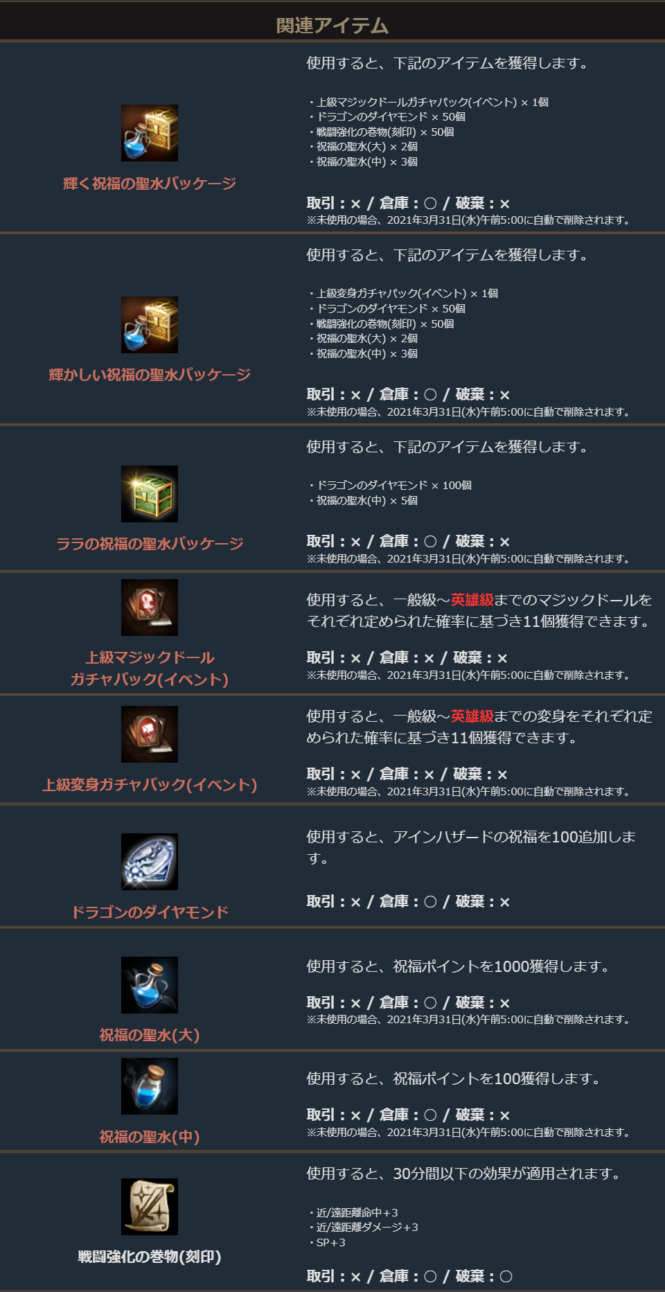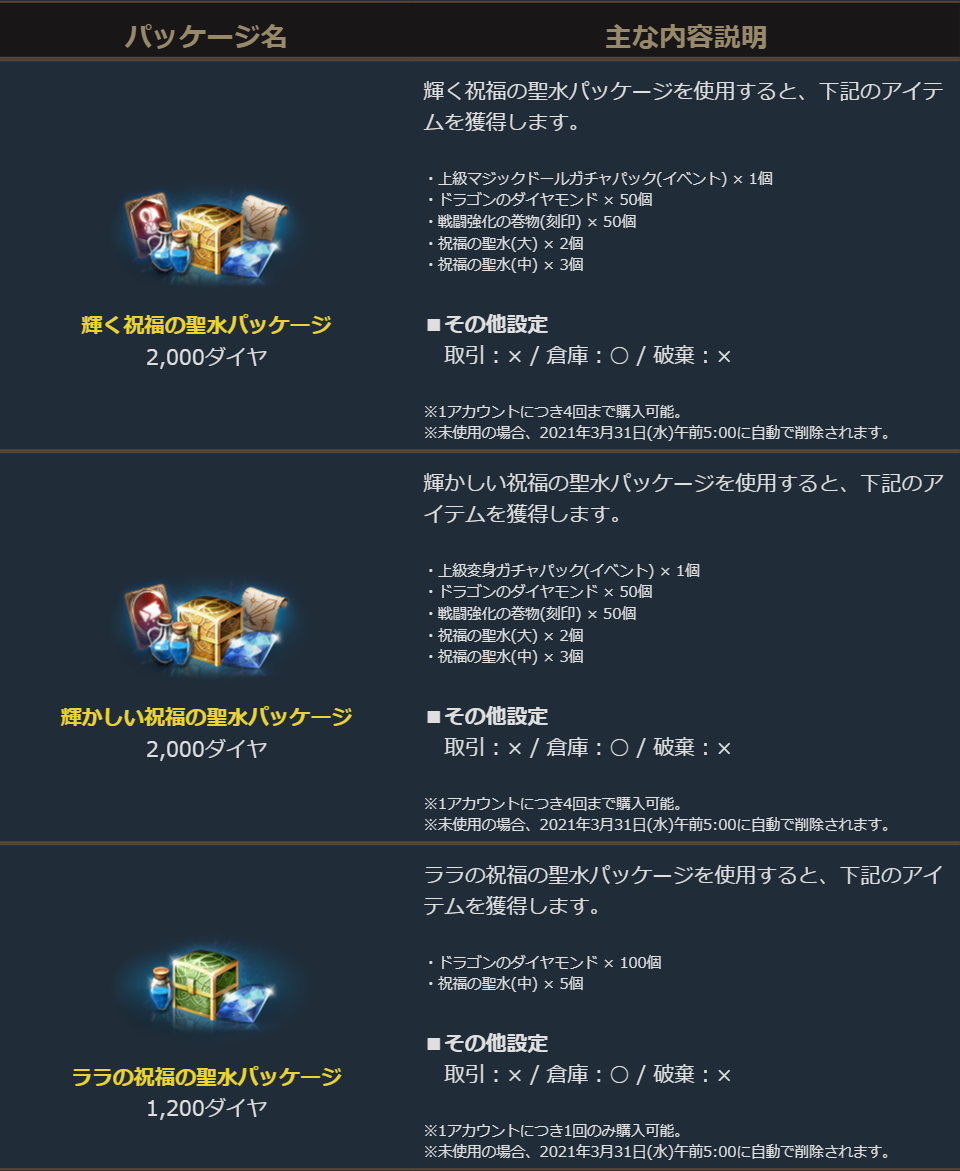 2021年3月17日より、ゲーム内ショップで「祝福の聖水パッケージ」の販売を開始しました。