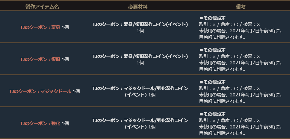 「TJのクーポン製作コイン」を使用して、各種「TJのクーポン」を製作できます。