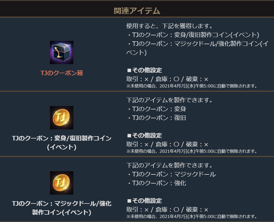 ・「TJのクーポン:強化」で強化に成功したアイテムは対象外となります。