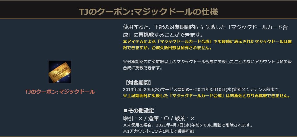 TJのクーポン:マジックドールは、対象期間内に合成失敗した最高等級のマジックドールカードの合成に再挑戦できる特別なアイテムです。