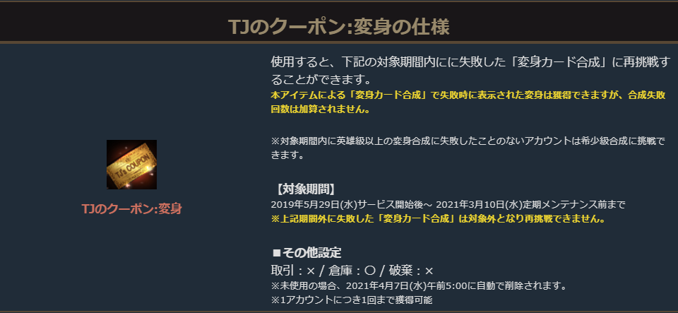 TJのクーポン:変身は、対象期間内に合成失敗した最高等級の変身カードの合成に再挑戦できる特別なアイテムです。