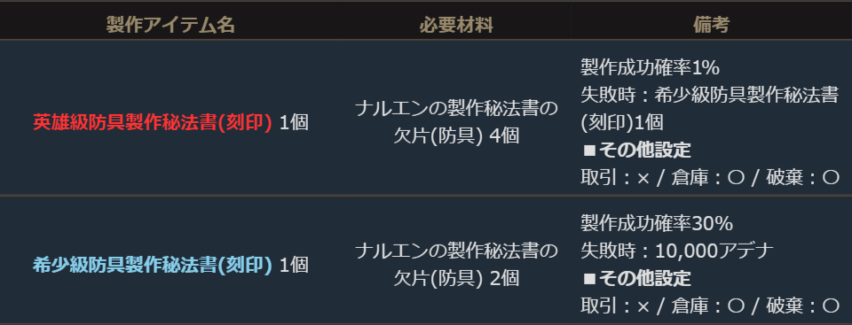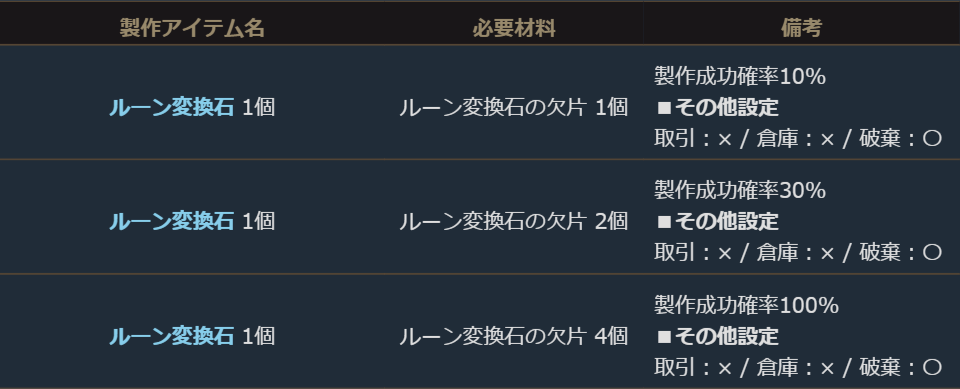 成功時に獲得できるアイテムと失敗時に獲得できるアイテム、成功率をご確認の上、製作にチャレンジしてください。