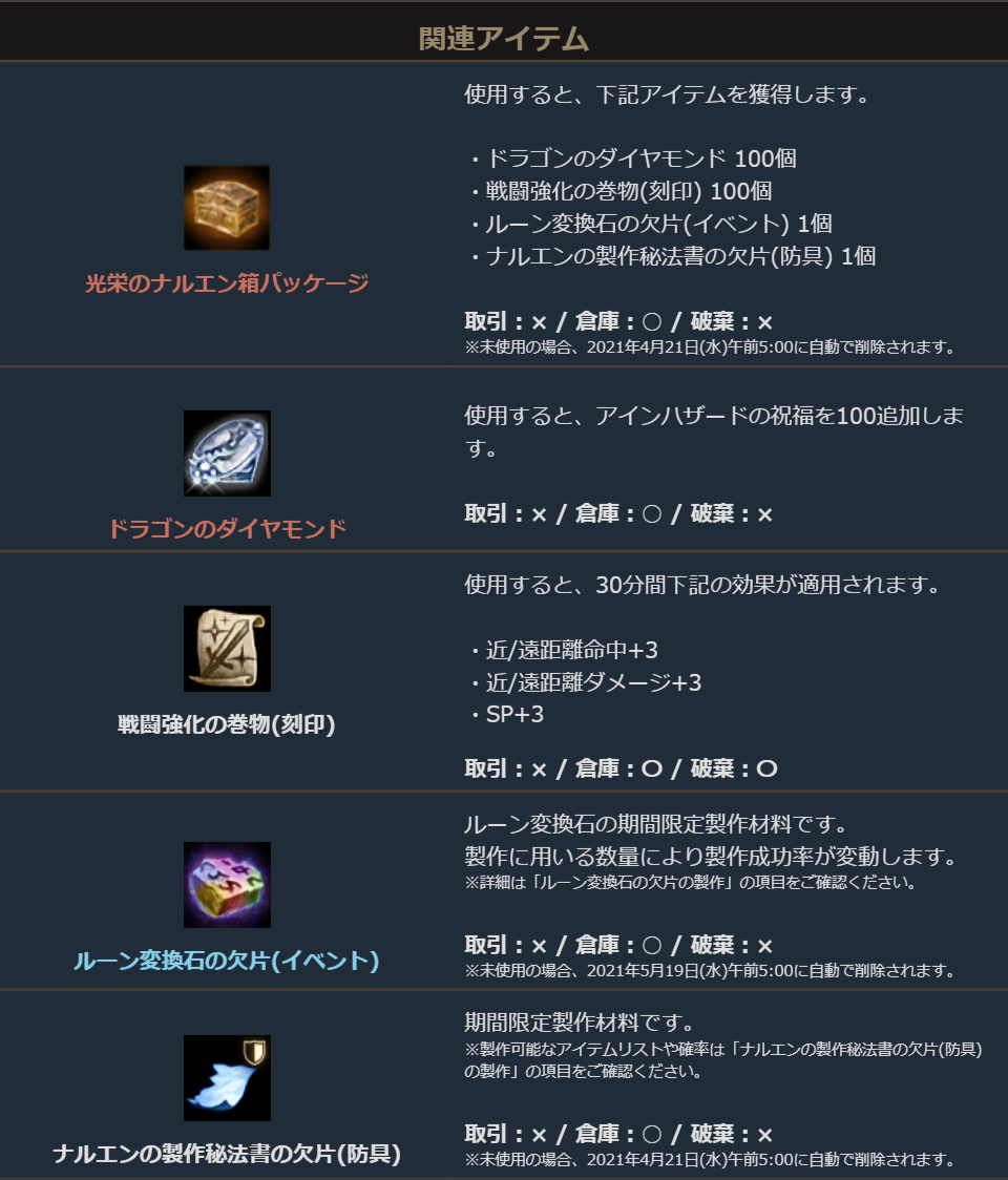 2021年3月24日より、ゲーム内ショップで「光栄のナルエン箱パッケージ」の販売を開始しました。