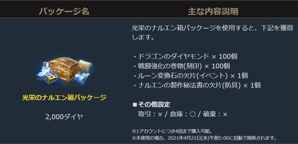 ドラゴンのダイヤモンドと戦闘強化の巻物(刻印)が100個ずつ手に入るほか、ルーン変換石や製作秘法書の製作にチャレンジできるパッケージです。