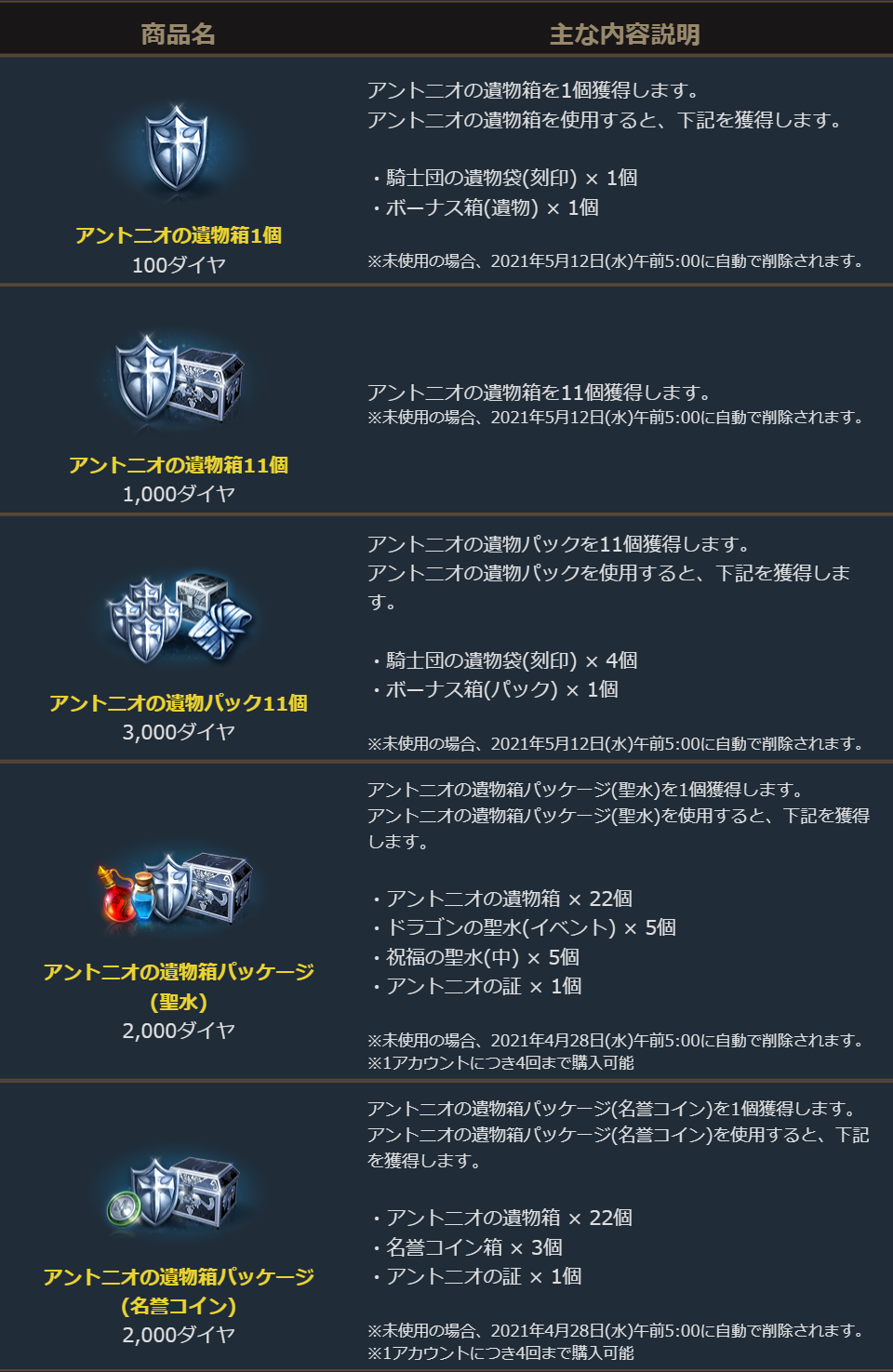 2021年3月24日より、ゲーム内ショップで「アントニオの遺物箱」の販売を開始しました。