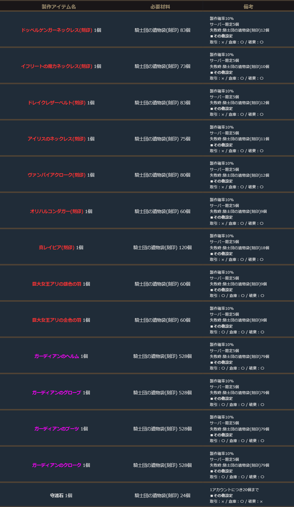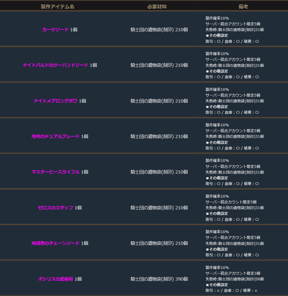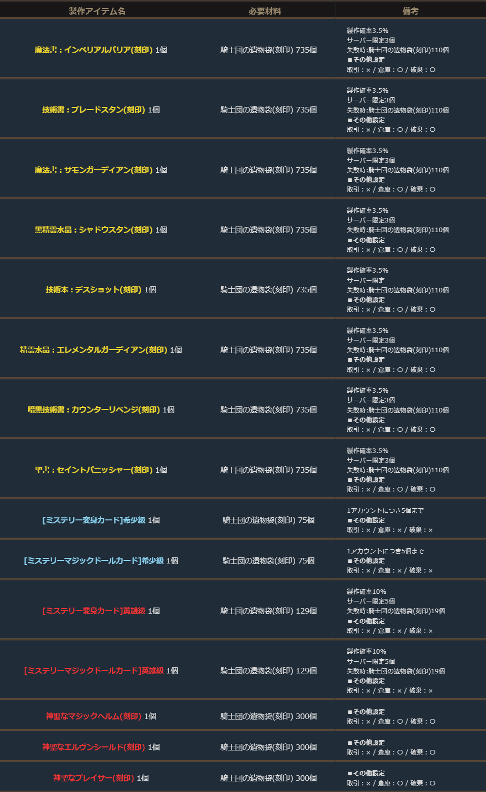 期間中、「騎士団の遺物袋(刻印)」を使用して、下記の製作を行うことができます。