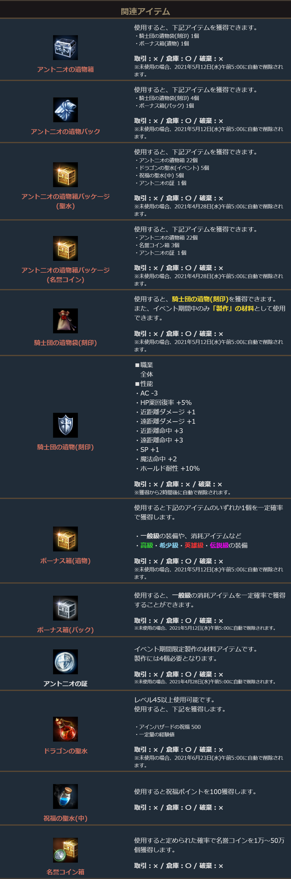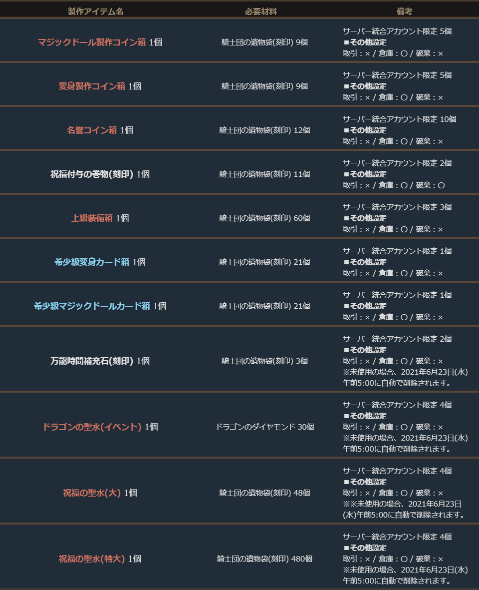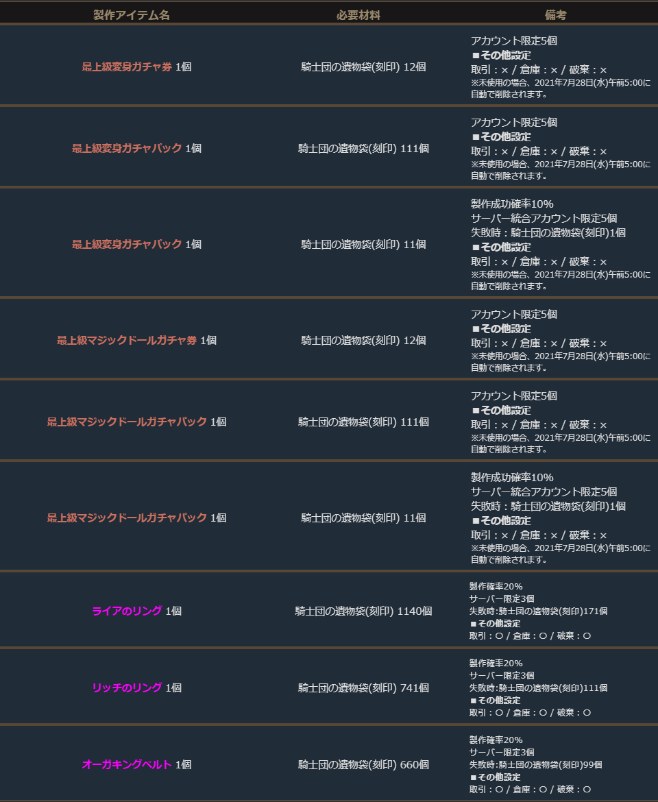 期間中、「騎士団の遺物袋(刻印)」を使用して、下記の製作を行うことができます。