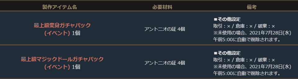 ※期間限定の製作アイテムは、製作可能期間のみゲーム内の「製作」より製作することができます。