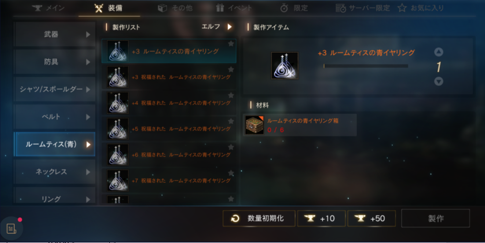 「ルームティスのイヤリング箱」を製作材料に使用する場合、同じ色の「ルームティスのイヤリング箱」を6つ使用して、+3まで強化された状態のルームティスのイヤリングを獲得することができます。
