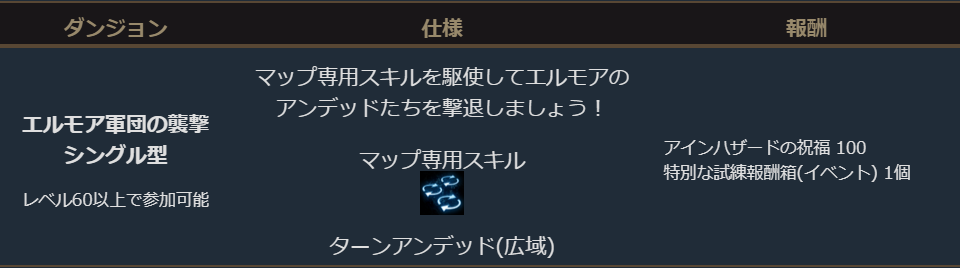 イベント期間中、「メニュー > ダンジョン > 試練ダンジョン」より、「エルモア軍団の襲撃」に挑戦できます。