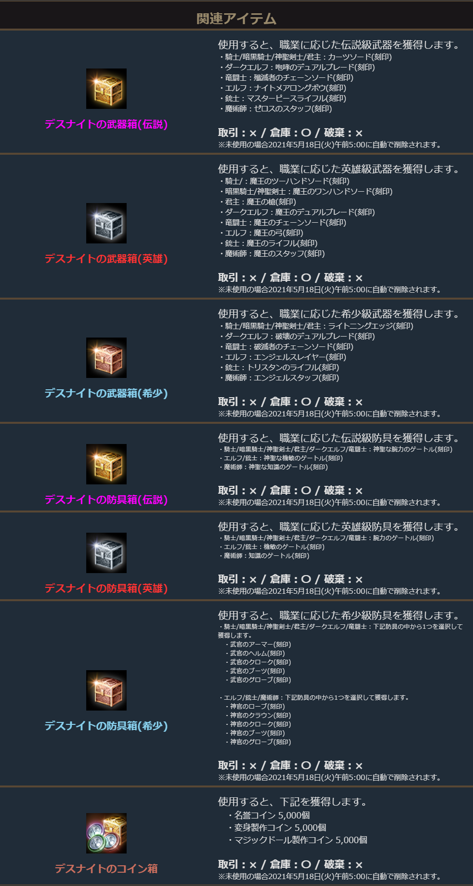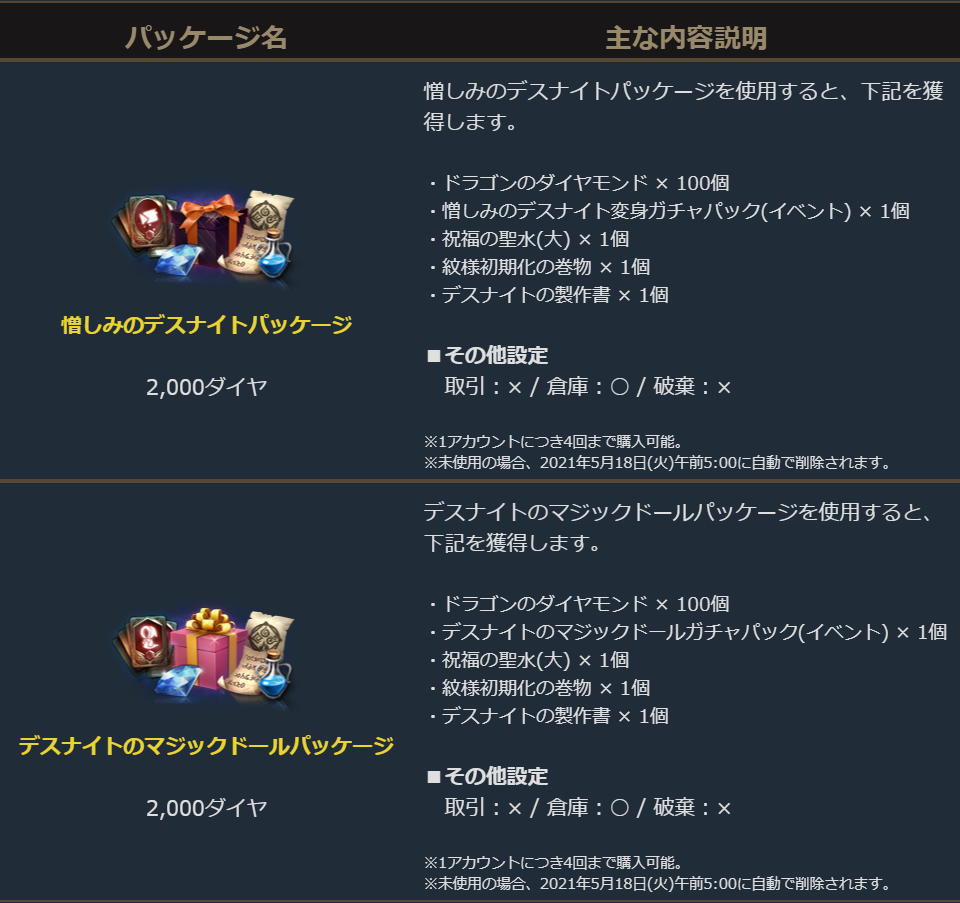 2021年4月21日より、ゲーム内ショップで「憎しみのデスナイトパッケージ」の販売を開始しました。