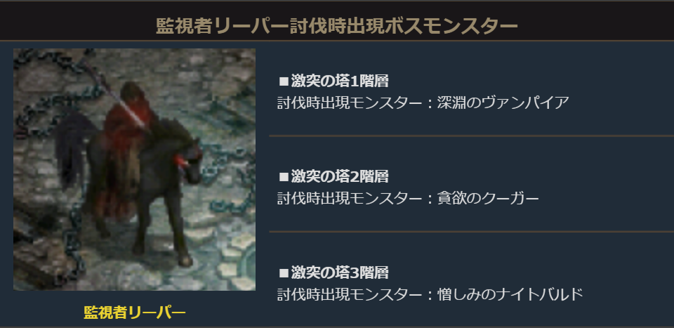 「監視者リーパー」に一定のダメージを与えると階層のボスモンスターへ変化し、同一階層にいるすべてのキャラクターが、階層の入口にテレポートします。