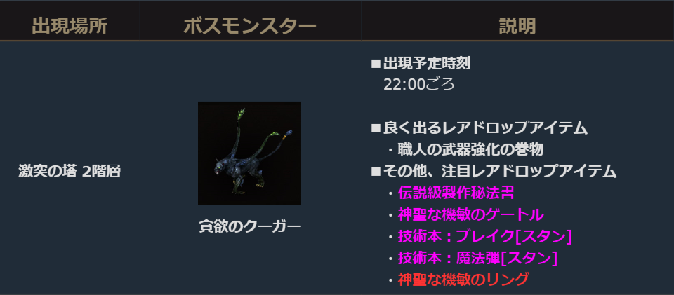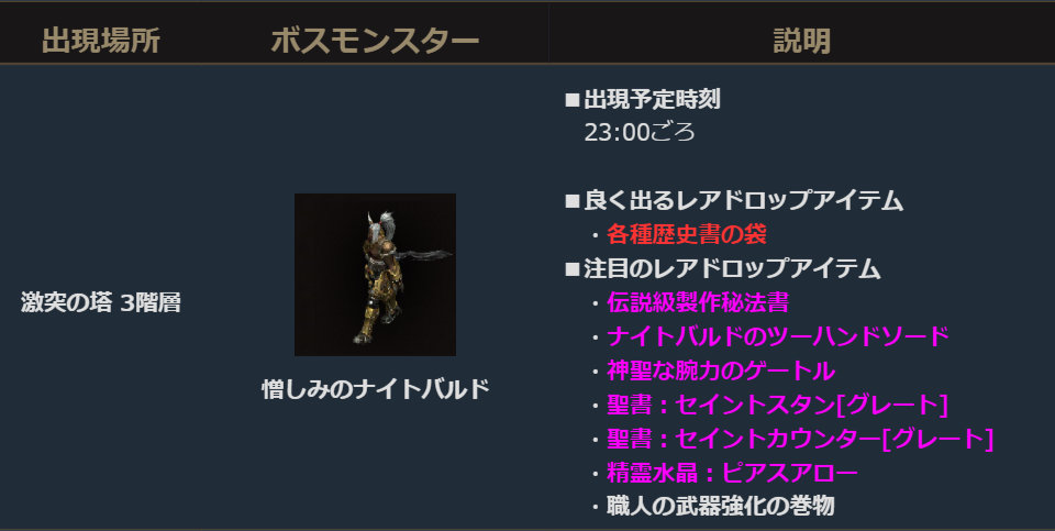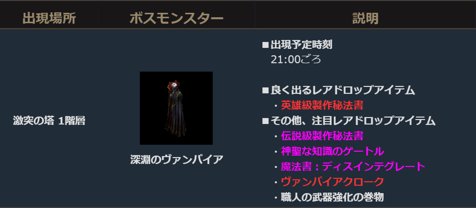特定の時間に出現するボスモンスターは、監視者リーパー討伐時に出現するボスよりも価値の高いアイテムがドロップしやすくなっております。