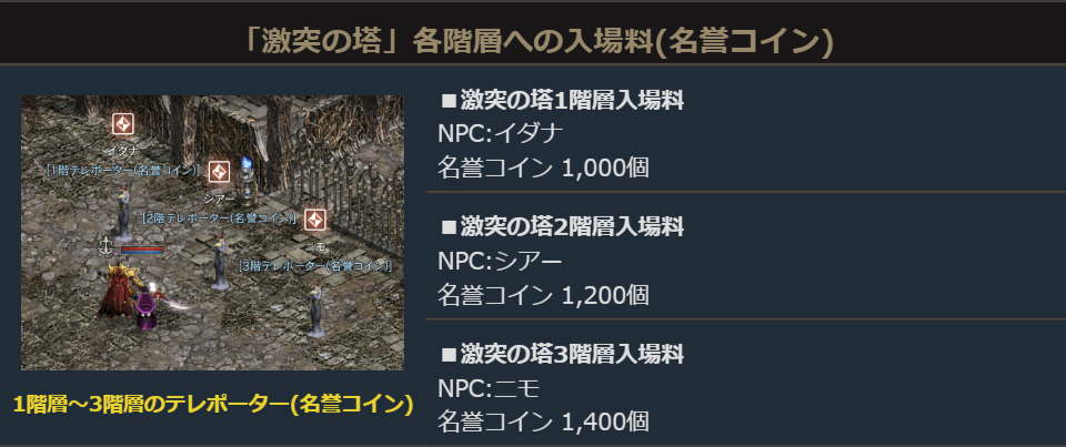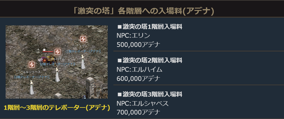 「激突の塔経由地」は雑貨商人や魔法の巻物商人、アデン商団や倉庫番もございますので十分に準備してから激突の塔へ挑戦してください。