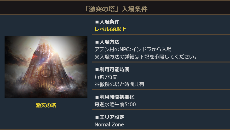 「激突の塔」は、レベル68以上のキャラクターが入場できる2週間限定のワールドダンジョンです。