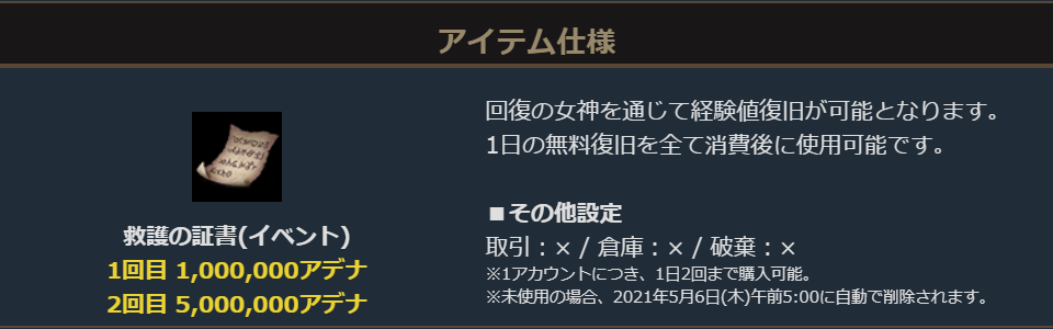 激突の塔開催を記念して、下記の期間はショップから「救護の証書(イベント)」をアデナで入手できます。