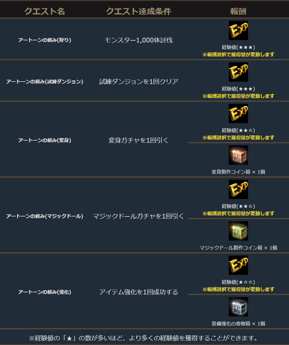「ヴァルキリーの成長ポーション」を使用して製作できる各「アートーンのクエスト書簡」は、使用すると専用クエストを受注できます。