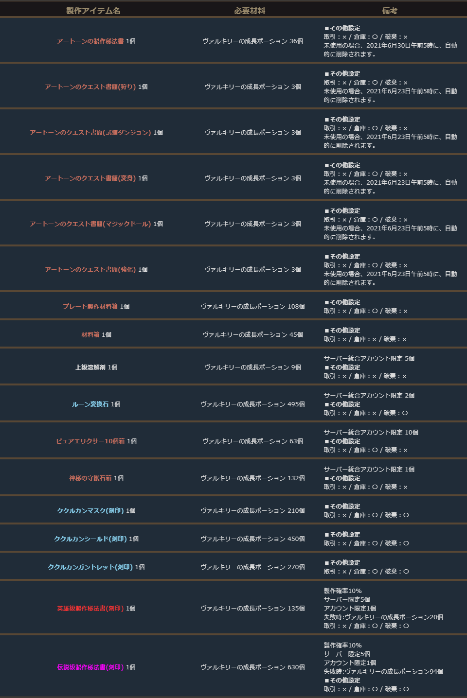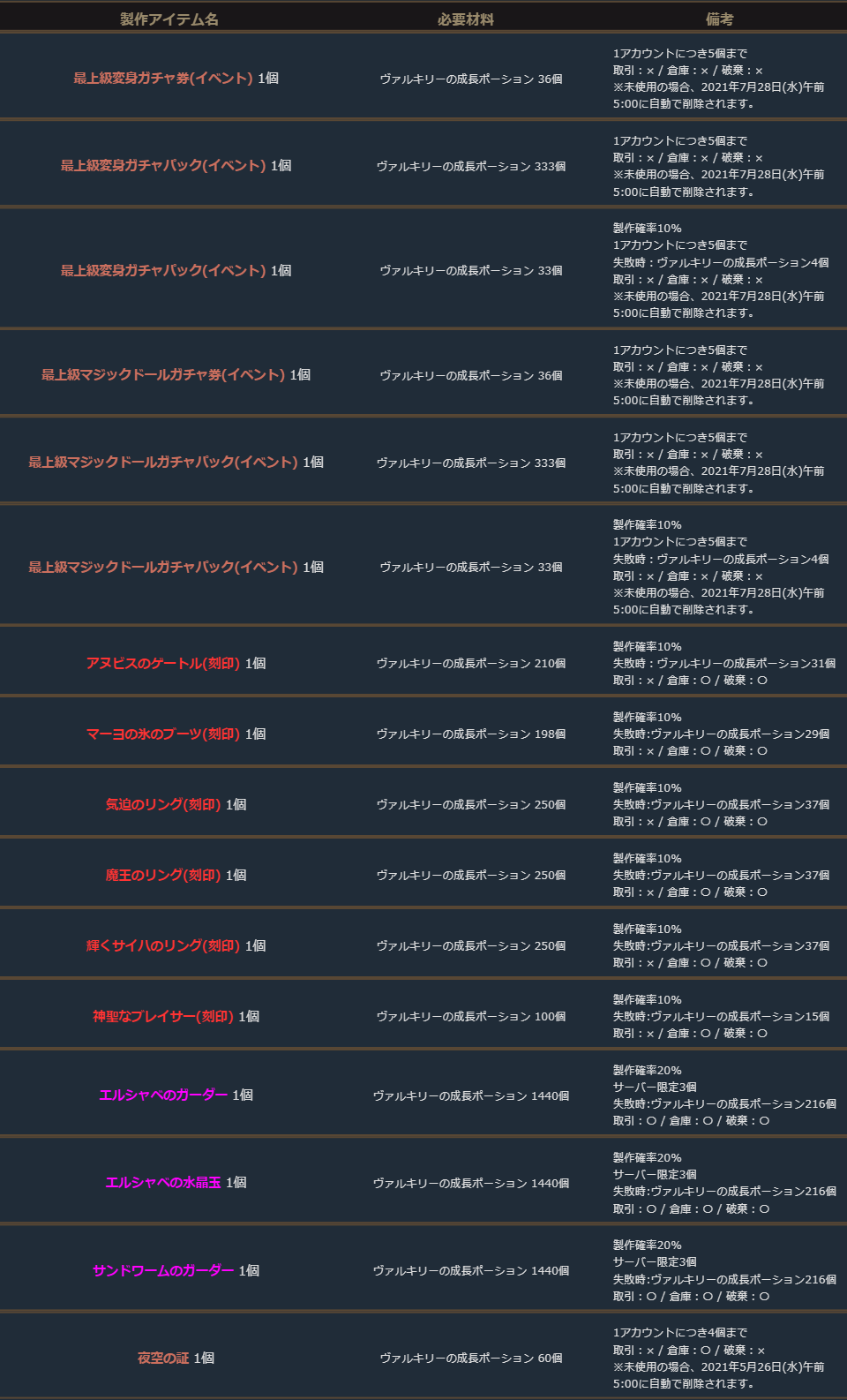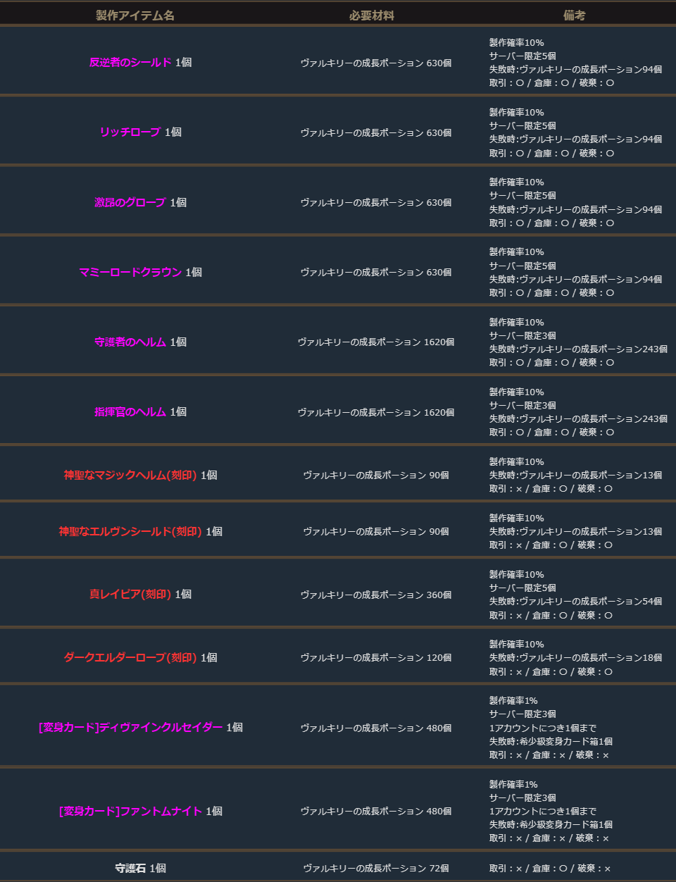 期間中、「ヴァルキリーの成長ポーション」を使用して、下記の製作を行うことができます。