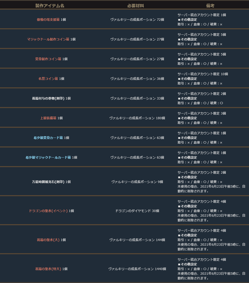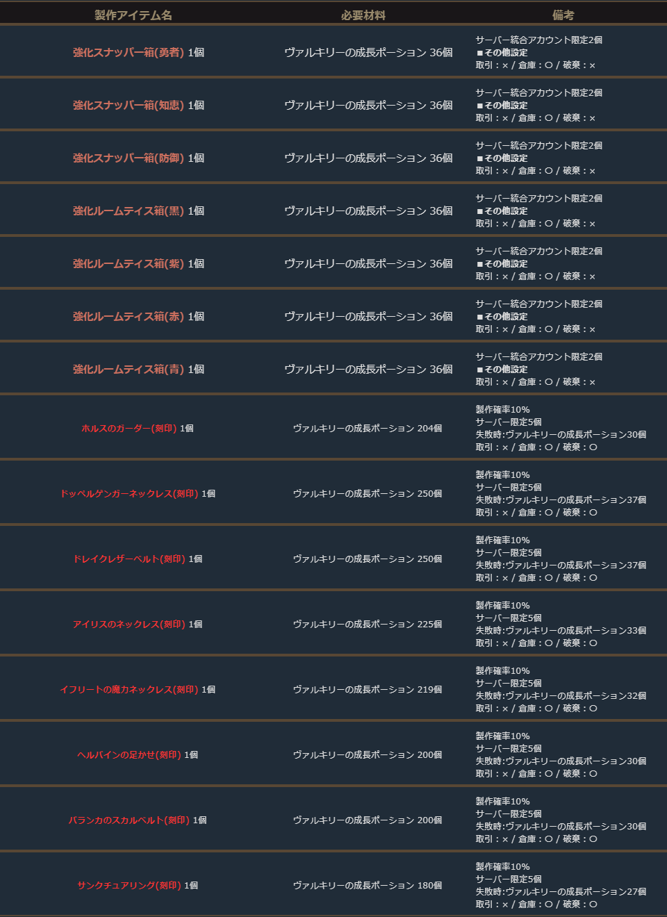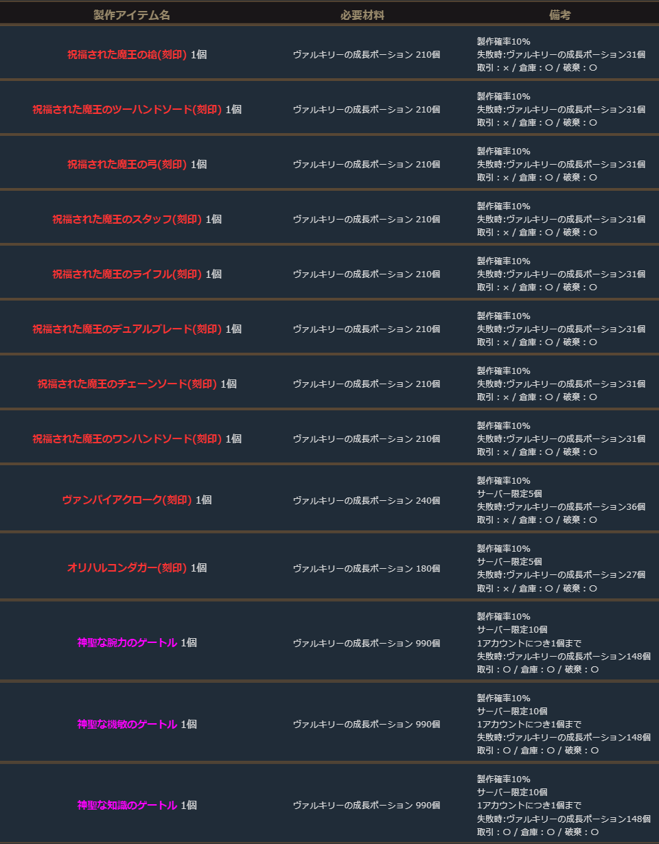 期間中、「ヴァルキリーの成長ポーション」を使用して、下記の製作を行うことができます。