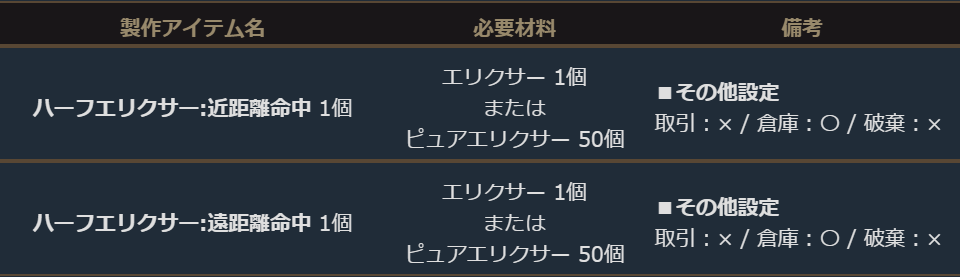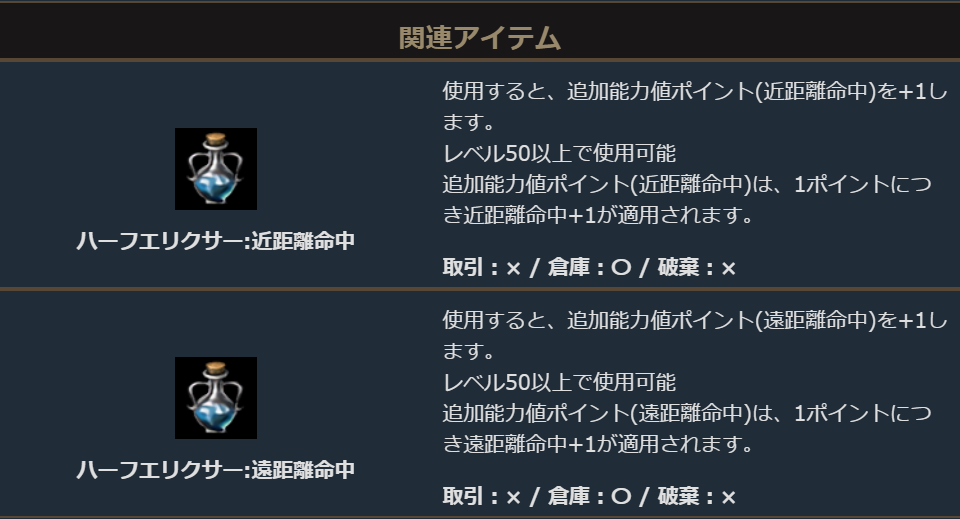 新たに「ハーフエリクサー:近距離命中」と「ハーフエリクサー:遠距離命中」を追加しました。