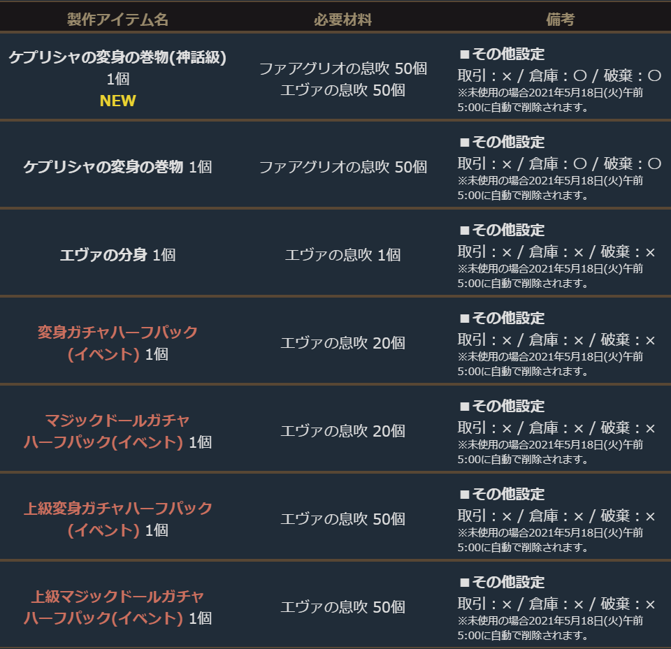 本イベント開始時より、イベント製作アイテム「ケプリシャの変身の巻物(神話級)」が追加されます。