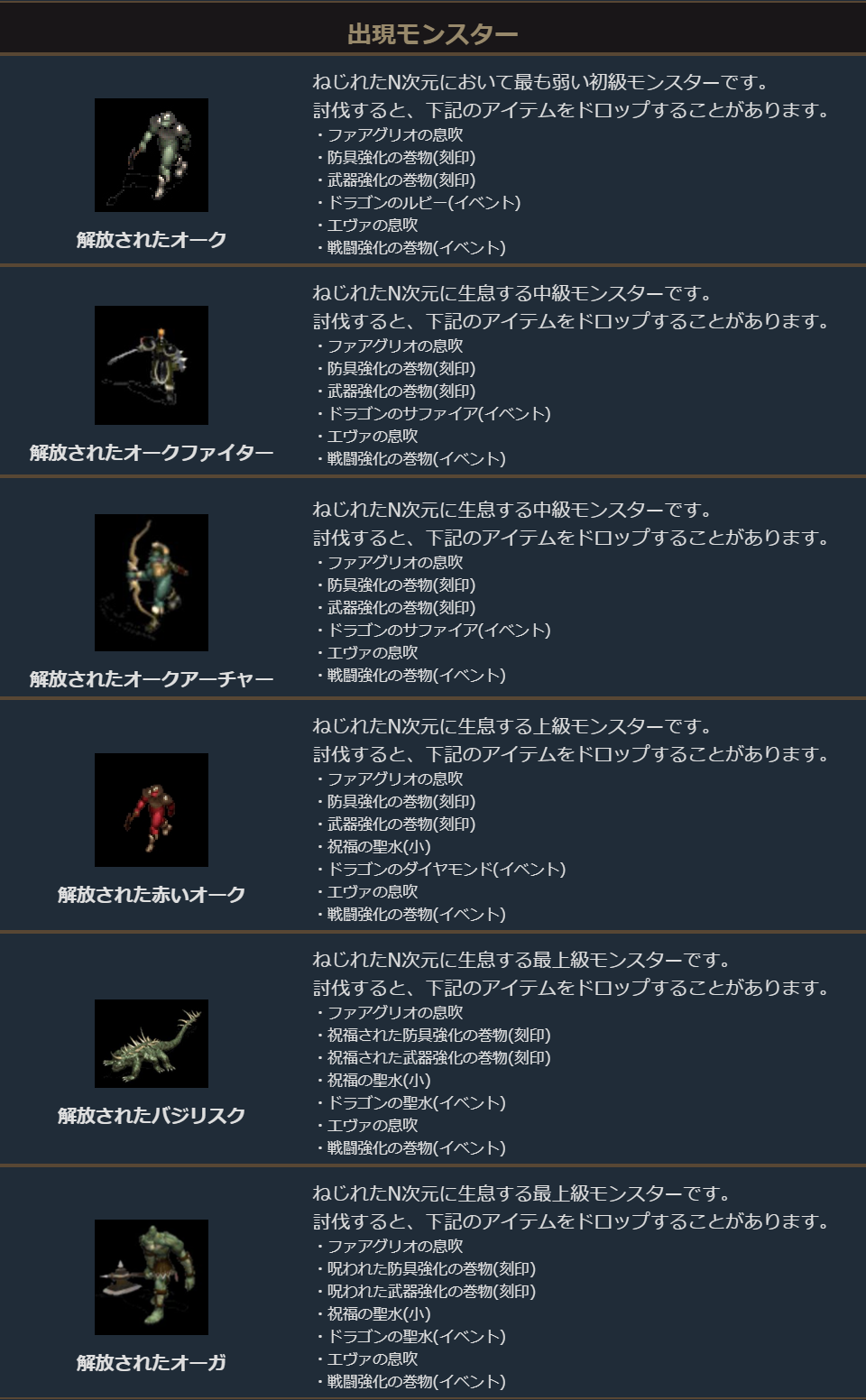 「ねじれたN次元」のモンスターを討伐すると、イベントアイテム「ファアグリオの息吹」「エヴァの息吹」や、各種強化の巻物などが入手できます。