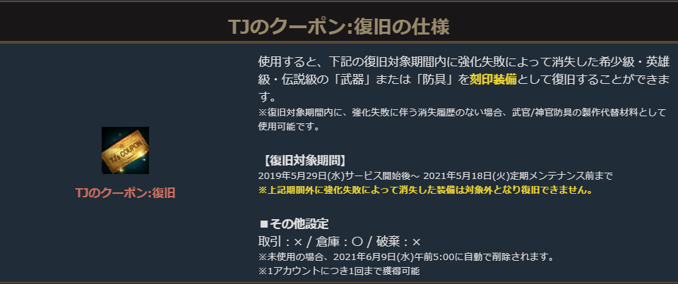 TJのクーポン:復旧は、対象期間内に希少級・英雄級・伝説級で強化失敗した武器や防具を復旧することができる特別なアイテムです。