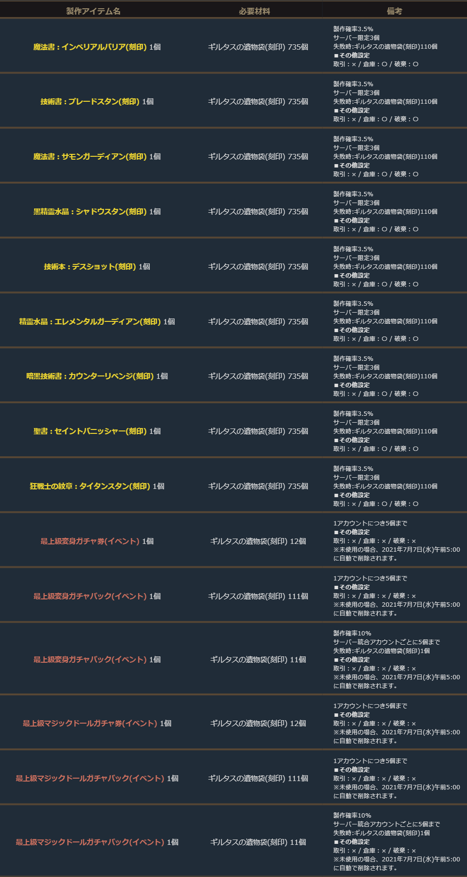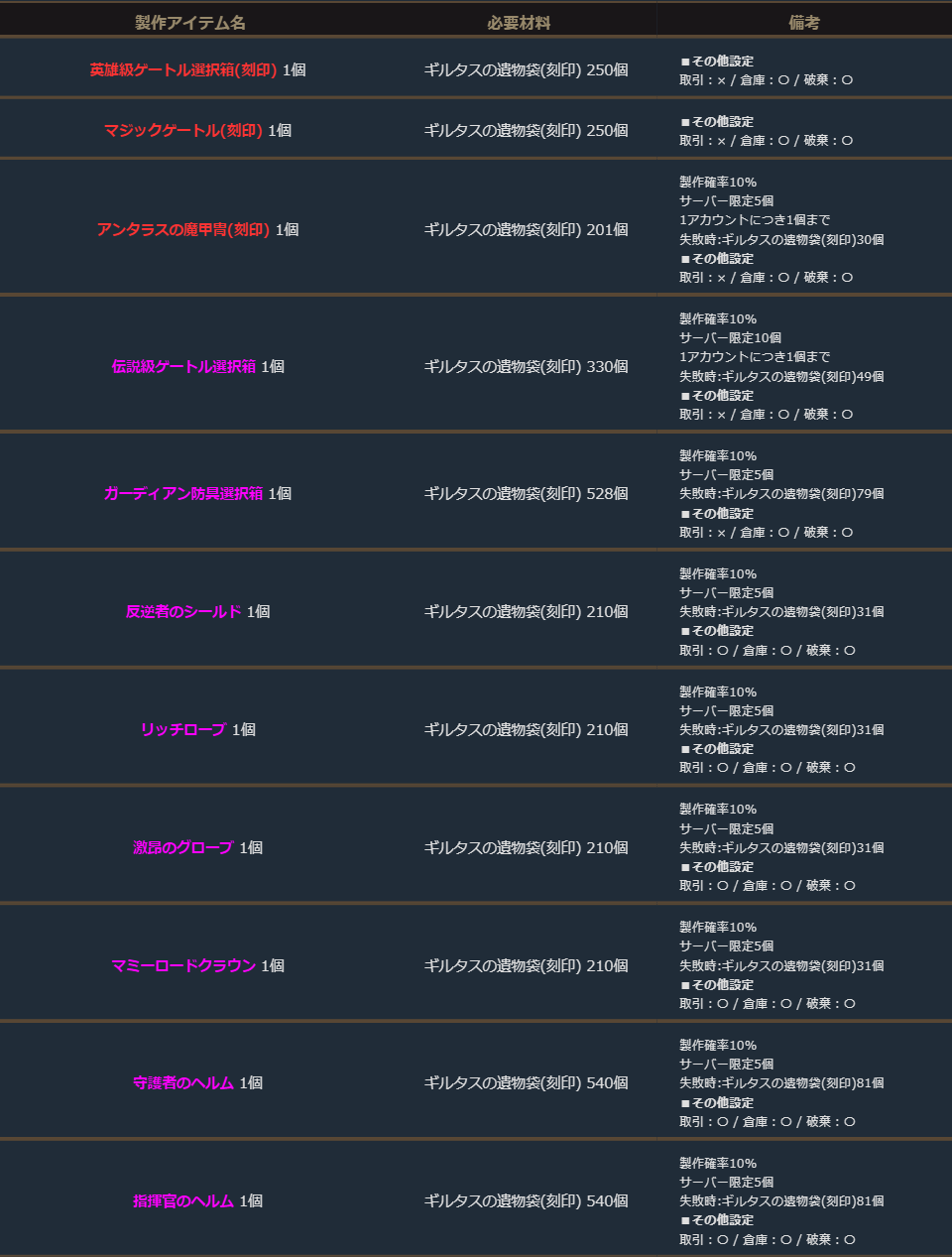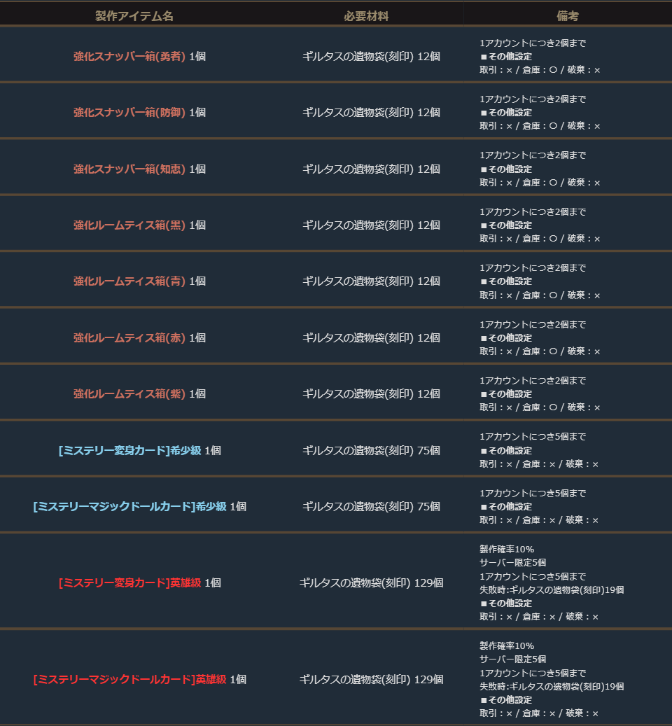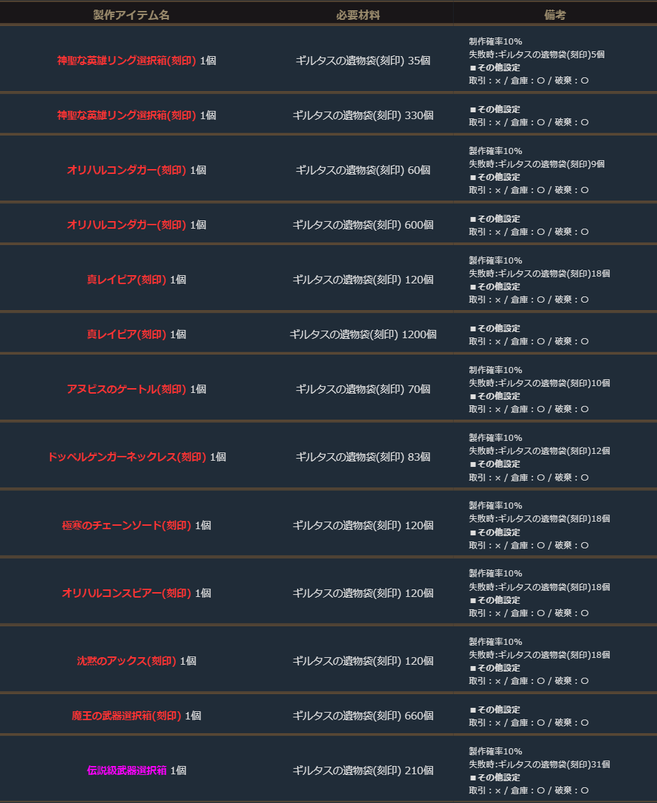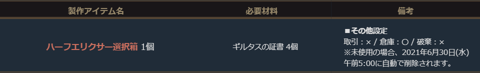 期間中、「ギルタスの遺物袋(刻印)」を使用して、下記の製作を行うことができます。