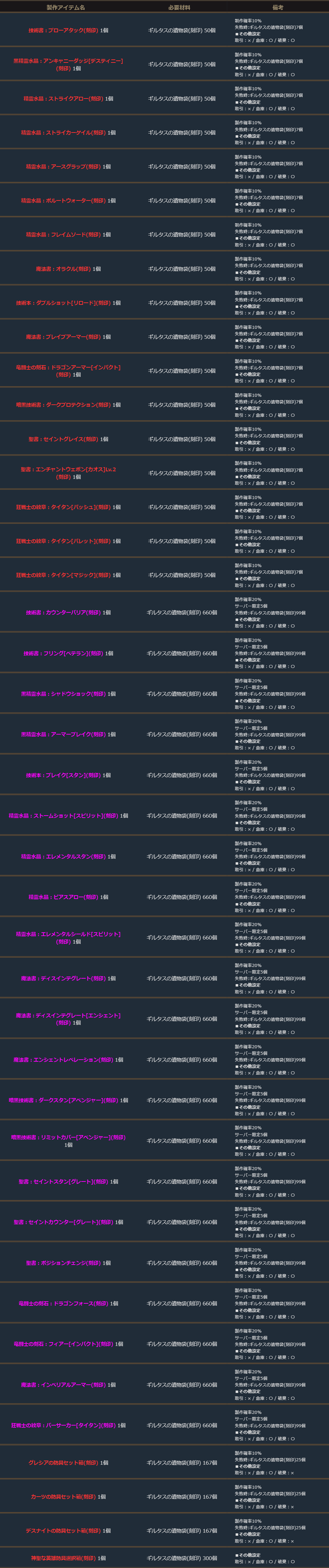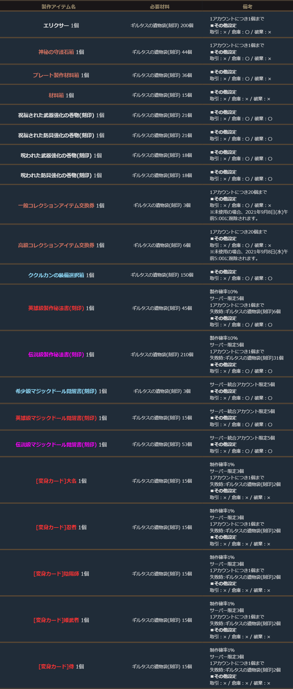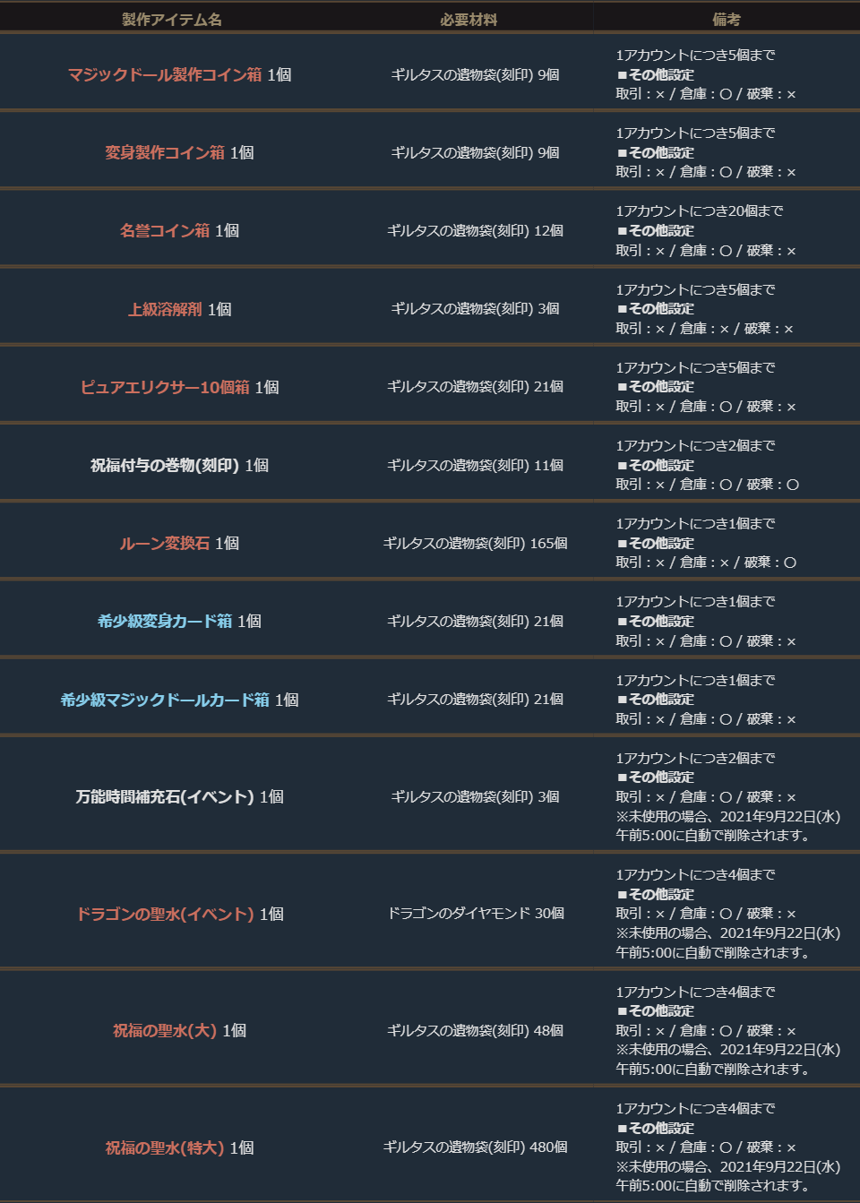 期間中、「ギルタスの遺物袋(刻印)」を使用して、下記の製作を行うことができます。